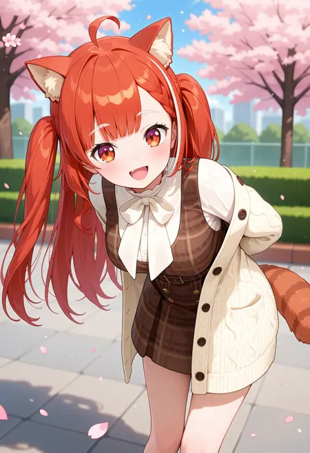outfit4-1ddpetit, long hair, red hair, two side up, ahoge, animal ears, streaked hair, braided bangs, mismatched eyebrows, orange eyes, tail, white bowtie, white shirt, pinafore dress, plaid dress, brown dress, white cardigan, long sleeves
