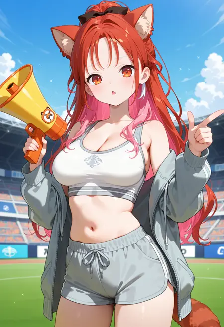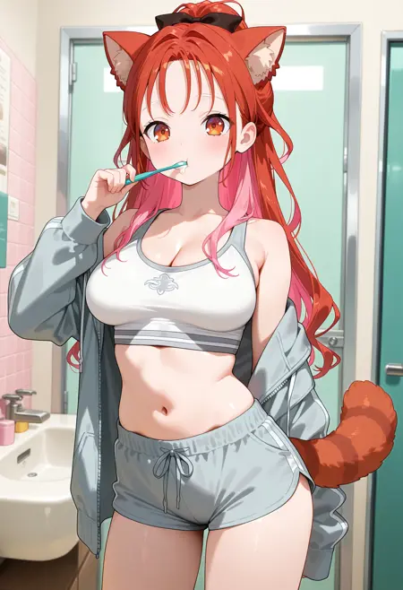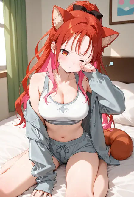 outfit6ffpetit, long hair, multicolored hair, red hair, ponytail, hair bow, animal ears, mismatched eyebrows, orange eyes, tail, pajamas, bare shoulders, cleavage, off shoulder, white sports bra, grey jacket, long sleeves, midriff, short shorts, grey shorts