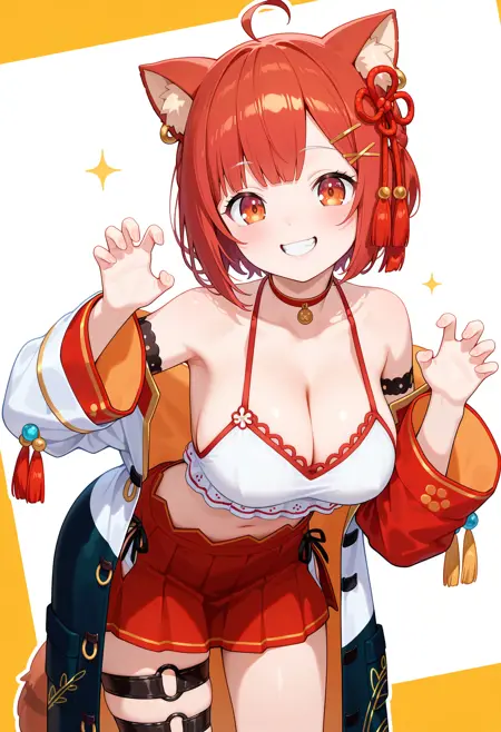 outfit2-2bbpetit, short hair, red hair, ahoge, animal ears, tassel hair ornament, hairclip, mismatched eyebrows, orange eyes, tail, red choker, cleavage, crop top, white camisole, arm strap, off shoulder, multicolored jacket, open jacket, long sleeves, sleeves past wrists, red skirt, thigh strap