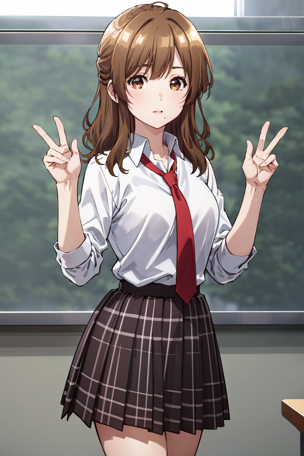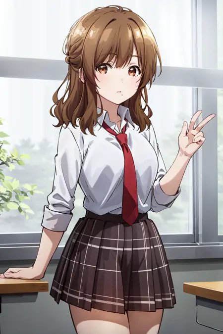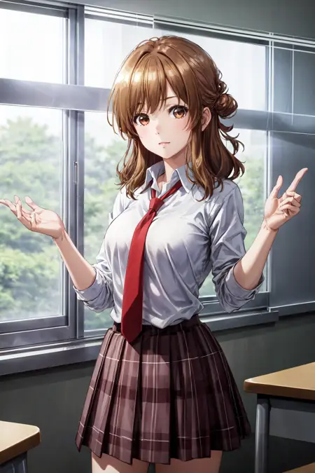 ((best quality, high quality, masterpiece, highres)), izumi yuzu, 1girl, solo, school uniform, white shirt, red necktie, skirt, looking at viewer, cowboy shot