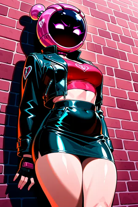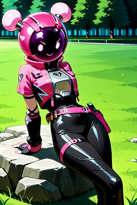 Pink Jacket, Cropped Jacket, Thigh Strap, Black Bodysuit, Bodysuit, Black Arm Warmers, Pink Fingerless Gloves, Loose Belt, Leg Holster, Chest Guard, Pink Footwear, Pink Boots, Pouch, Boots