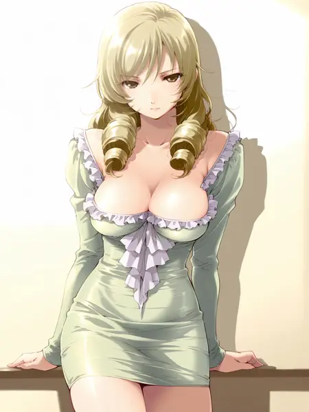 服装:绿色连衣裙,紧身裙,荷叶边裙,露乳,短裙,长袖