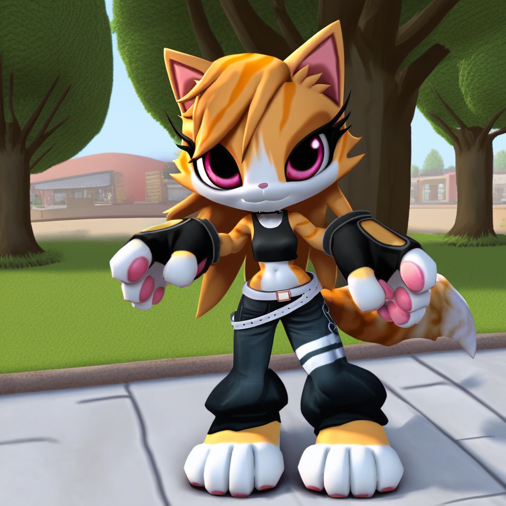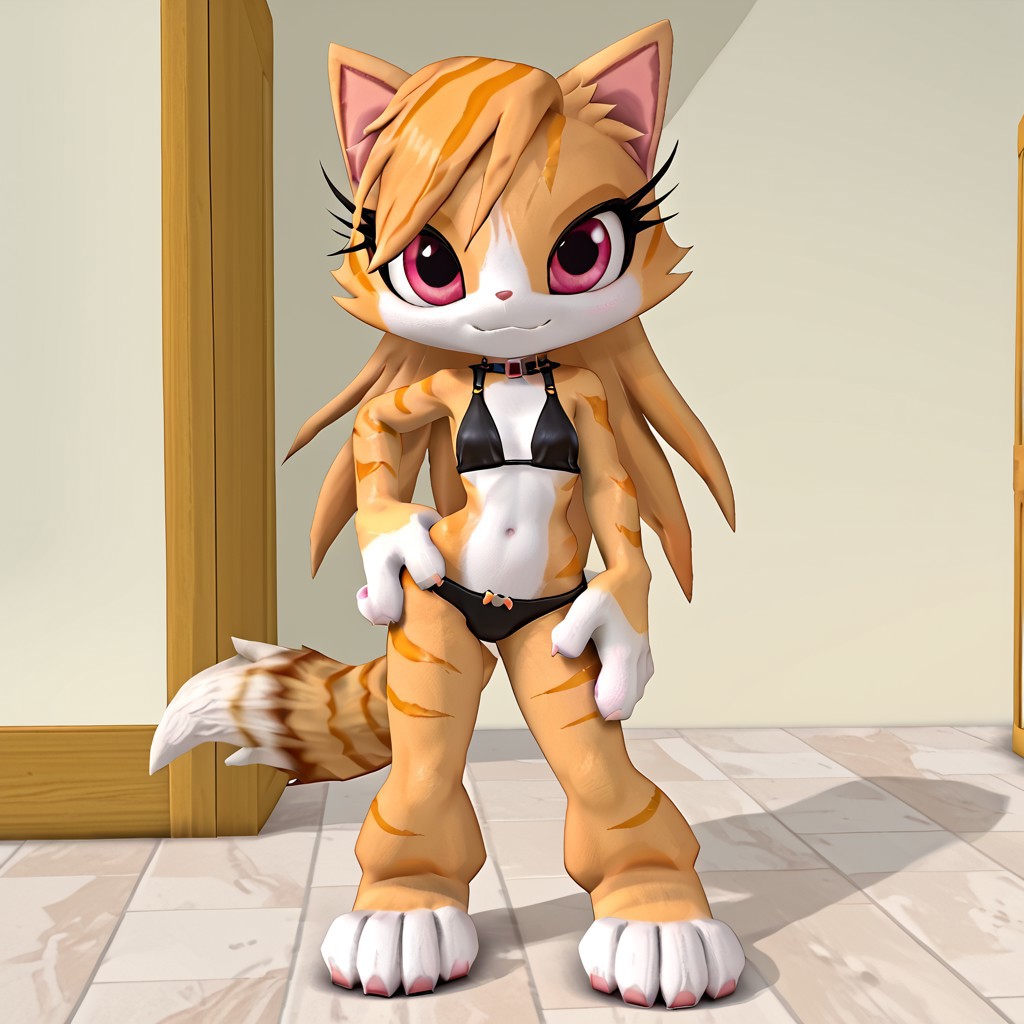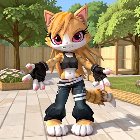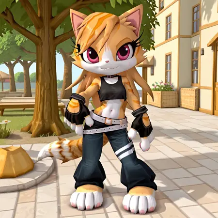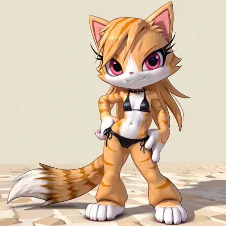 cat, cat girl, yellow fur, striped fur, yellow hair, long hair, pink eyes, pink nose, white snout, cat ears, striped cat tail,