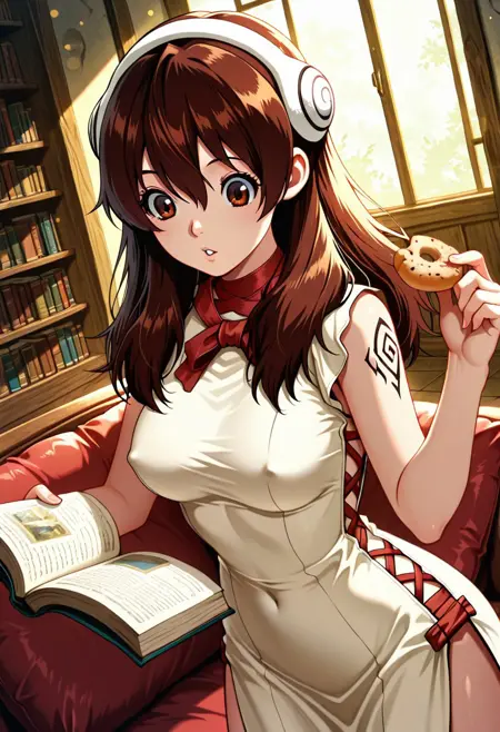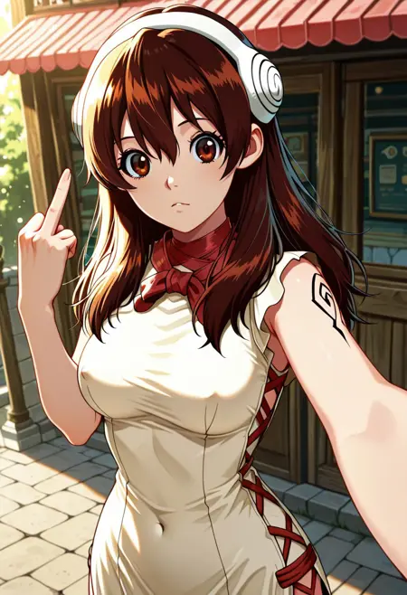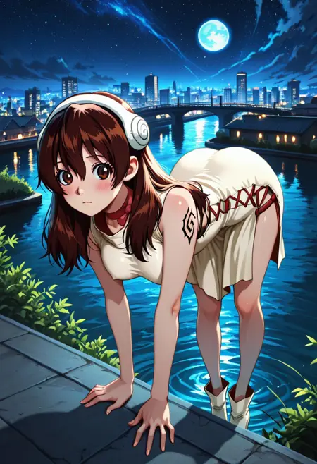 キャラクターの外見:茶色の髪、長い髪、額に髪がかかる、前髪、肩まで届く髪、茶色の目、白いヘッドフォン、首輪リボン、ネックテープ、腕のタトゥー、中くらいの胸