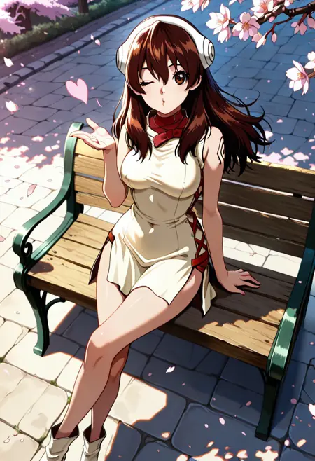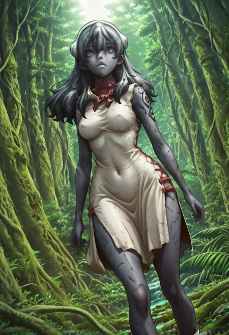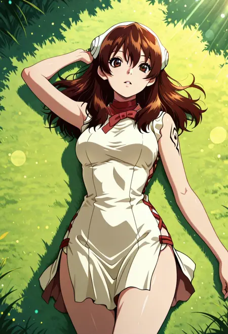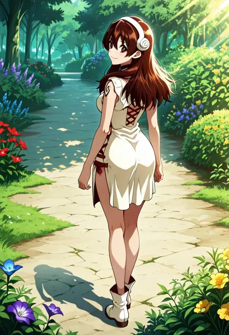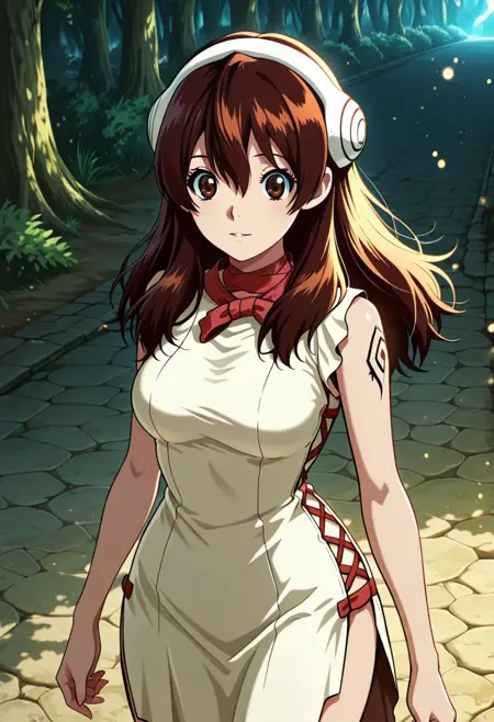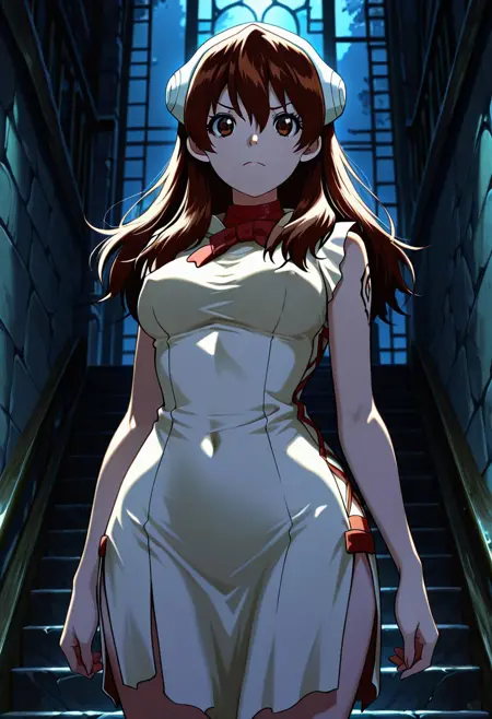 キャラクターの基本的な衣装:白いドレス、ノースリーブ、腕を露出、サイドスリット、サイドレース、白い靴