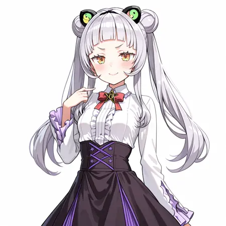 트리거: Shion, 1girl, murasaki shion, 머리묶음, 배꼽, 긴 머리, 회색 머리, 허리선, 검은 치마, 긴 소매, 단정한 앞머리, 공식 대체 복장, 더블 뱅, 크롭 상의, 줄무늬 리본, 보라색 리본, 크롭탑, 작은 가슴, 트윈테일, 옆머리, 허벅지 길이 양말, 프릴 치마, 프릴, 생식기, 검은 셔츠, 리본넥타이, 복부, 머리띠, 미니스커트, 네일아트, 노란 눈, 조끼, 머리 장식, 손목을 넘는 소매, 가슴선, 넓은 소매, 대체 헤어스타일, 카우보이 샷