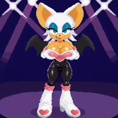 rtblpd, rouge the bat, bat girl, white fur, orange skin, pink lips, bat ears, aqua eyes, eyeshadow, animal nose, bat wings, black bodysuit, white gloves, white high heel boots, pink trim