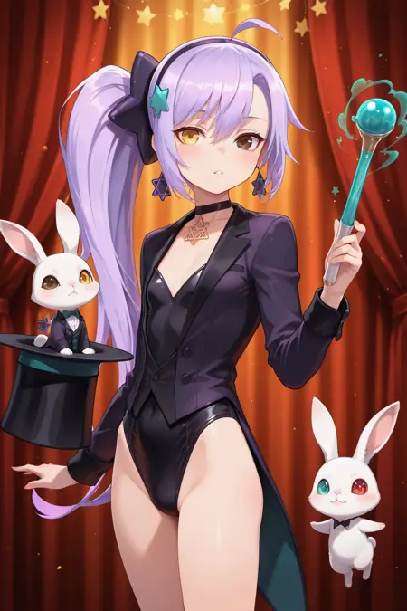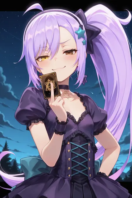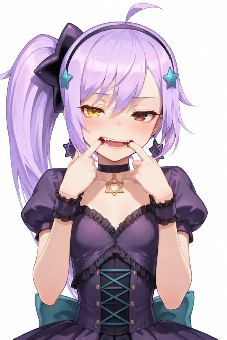 stella6135, 黄色眼睛, (棕色眼睛:0.8), 异色瞳, 紫色头发, 侧马尾, 长发, 发带, 星形发饰, 星形耳环, 六芒星, 天线发, 马尾圈,