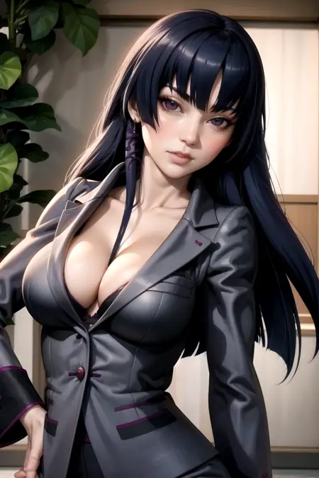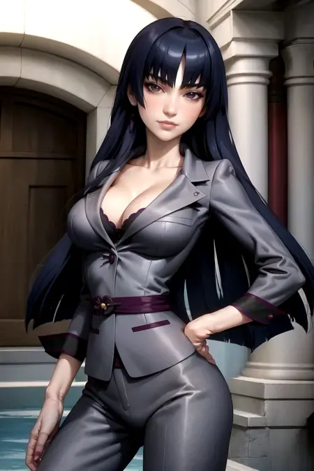 Prompt: lora:ShionKasugaiV1:1.0 shion_kasugai, long_hair, solo, std_suit, cleavage