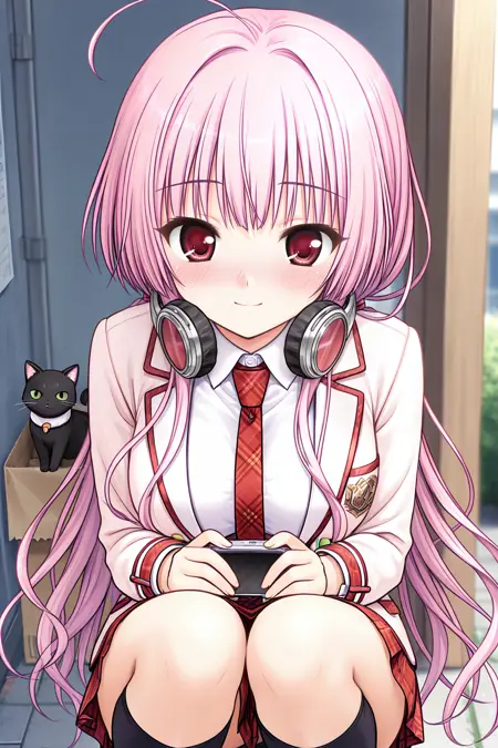 学园制服,西装外套,粉红色外套,敞开外套,长袖,红色领带,格纹领带,校徽,白衬衫,有领衬衫,纽扣,红裙子,迷你裙,格纹裙,百褶裙,绝对领域,黑色过膝袜,乐福鞋,棕色鞋履,