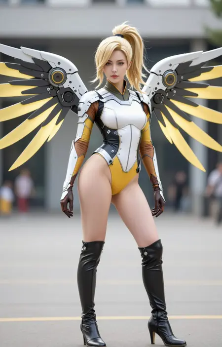 트리거: realistic, mechanical wings, mercy, zitmercy, solo, blonde hair, wings, breasts, leotard, adapted costume, blue eyes, ponytail, looking at viewer, realistic, lips, yellow wings, blurry background, nose, medium breasts, halo, highleg leotard, blurry, high ponytail, outdoors, standing, long sleeves, thighhighs, cowboy shot, parted lips