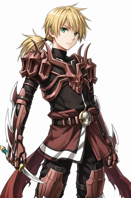 프롬프트: guilROMale, breastplate, turtleneck, red armor, gauntlets, shoulder armor, gloves, pauldrons, black bodysuit, waist cape, belt, black pants, armored boots, leg armor, greaves