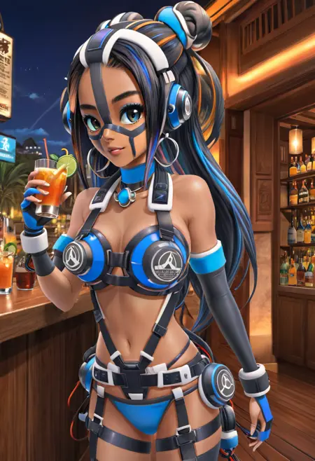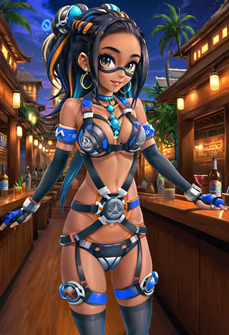 Typical look: 1girl, speakini, multicolor long hair, orange hair, twintails, slight smile, mask, face straps, bra, bare shoulders, wristbands, dark gray elbow gloves, dark gray thighhighs, fingerless gloves, neck choker, vibrator, harness, headphones, cybernetics