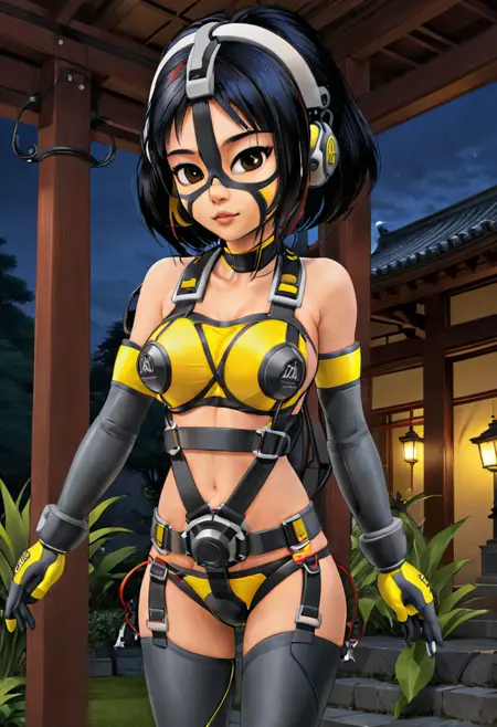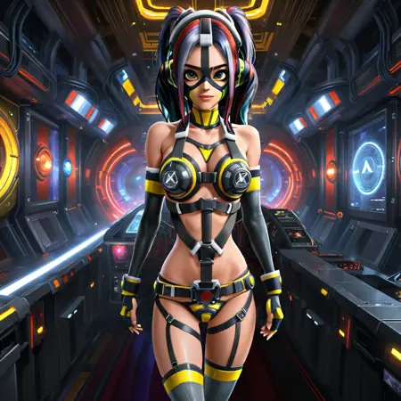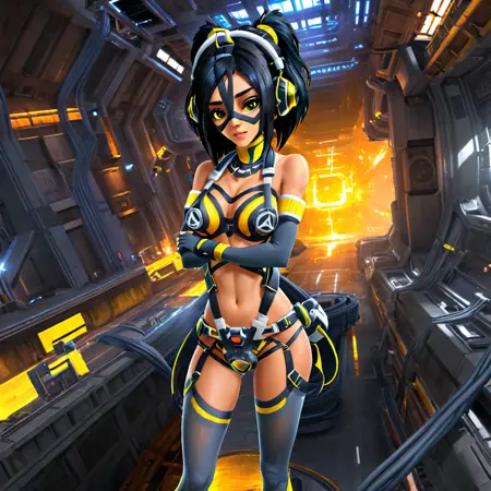 일반적인 모습: 1girl, speakini, 다채로운 긴 머리, 주황색 머리, 더블 테일, 미소, 마스크, 얼굴 스트랩, 브라, 어깨 노출, 팔찌, 짙은 회색 팔꿈치 장갑, 짙은 회색 허벅지 양말, 손가락 없는 장갑, 목걸이, 바이브레이터, 하네스, 헤드폰, 사이버네틱스
