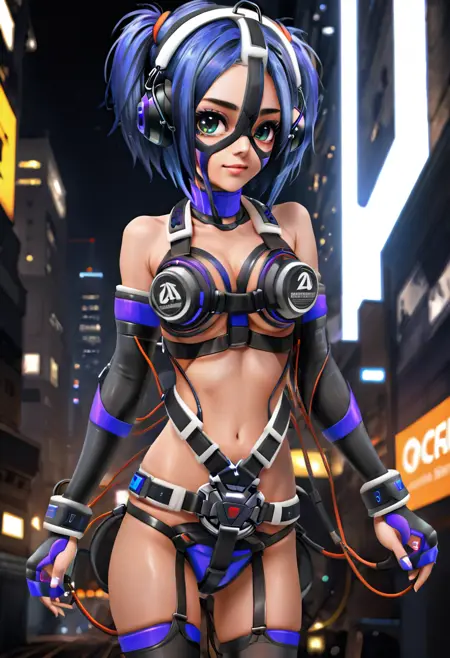 Typical look: 1girl, speakini, multicolor long hair, orange hair, twintails, slight smile, mask, face straps, bra, bare shoulders, wristbands, dark gray elbow gloves, dark gray thighhighs, fingerless gloves, neck choker, vibrator, harness, headphones, cybernetics