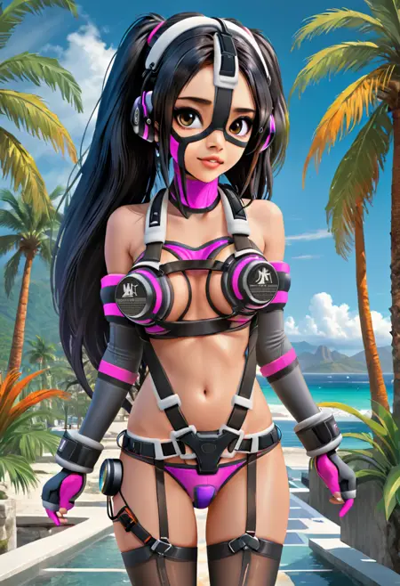 典型的な外観:1girl, speakini, 多色のロングヘア, オレンジヘア, ツインテール, 少し笑顔, マスク, フェイスストラップ, ブラ, 肩出し, リストバンド, 暗灰色の肘までガントレット, 暗灰色のハイソックス, フィンガーレスグローブ, 首輪, バイブレーター, ハーネス, ヘッドフォン, サイバネティクス