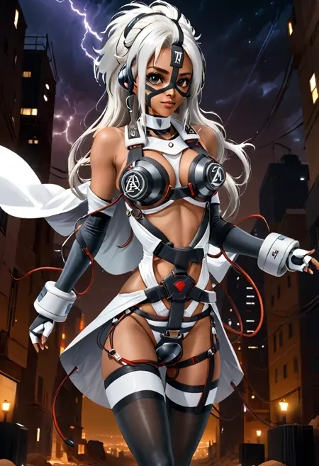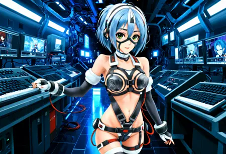 일반적인 모습: 1girl, speakini, 다채로운 긴 머리, 주황색 머리, 더블 테일, 미소, 마스크, 얼굴 스트랩, 브라, 어깨 노출, 팔찌, 짙은 회색 팔꿈치 장갑, 짙은 회색 허벅지 양말, 손가락 없는 장갑, 목걸이, 바이브레이터, 하네스, 헤드폰, 사이버네틱스