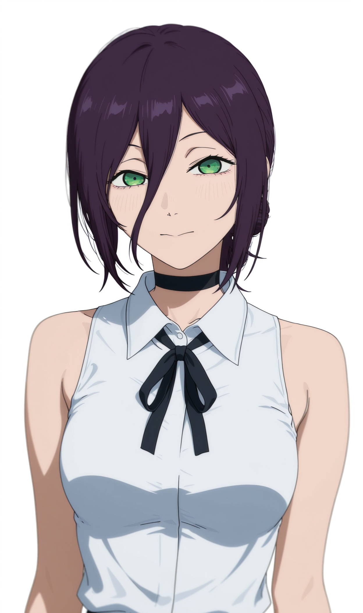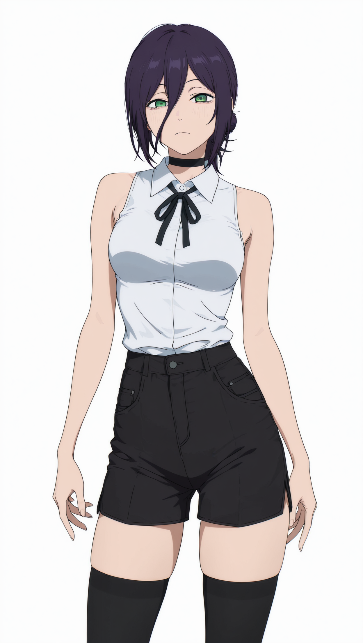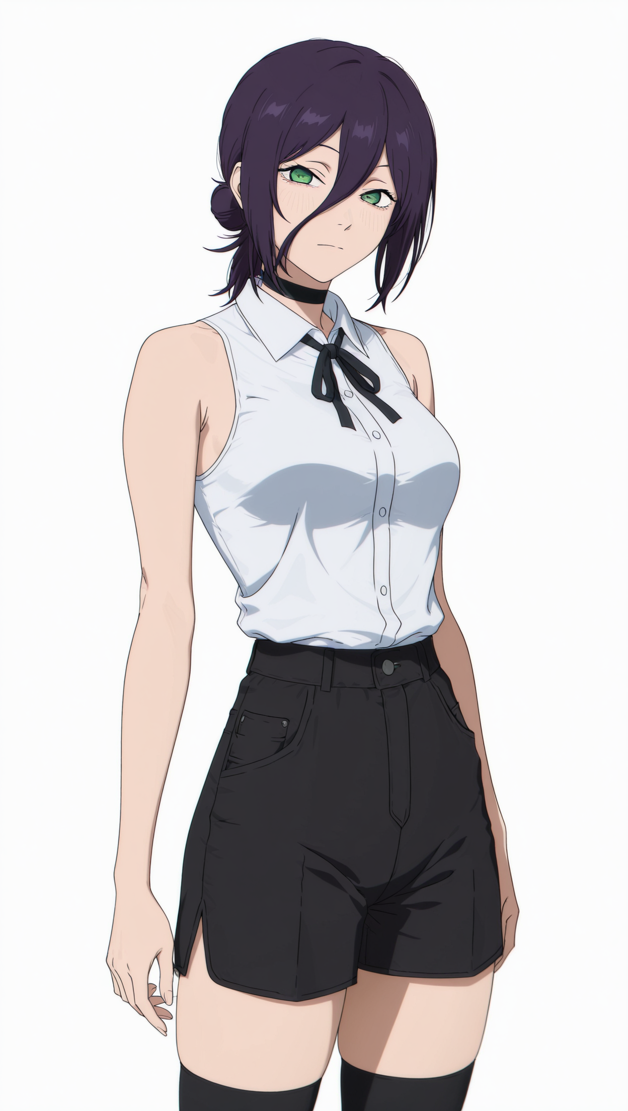 动漫上色,杰作,最佳质量,惊人的质量,r3z3,1个女孩,短发,发髻,紫色头发,绿色眼睛,中等胸部,项圈,衬衫,白衬衫,衬衫塞进裤子,颈带,无袖,短裤,黑色短裤,过膝袜,黑色过膝袜,单人,姿势,站立,看着观众,正面,((((白色背景,简单背景))))