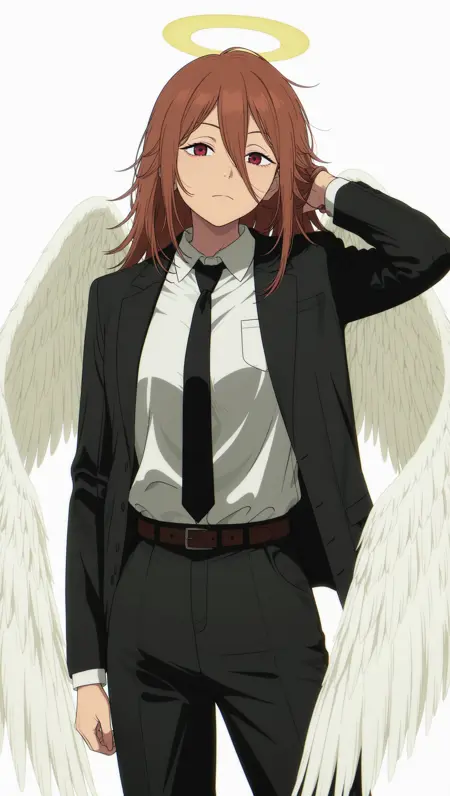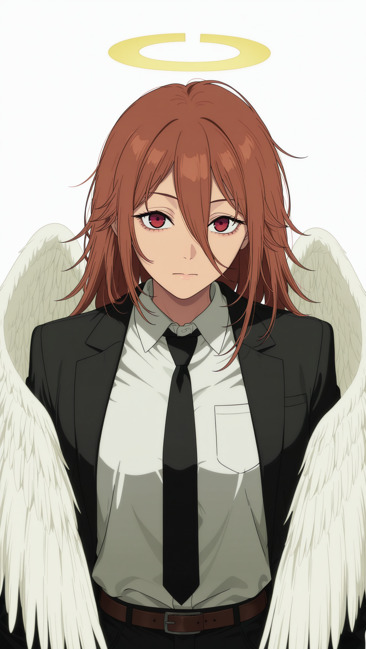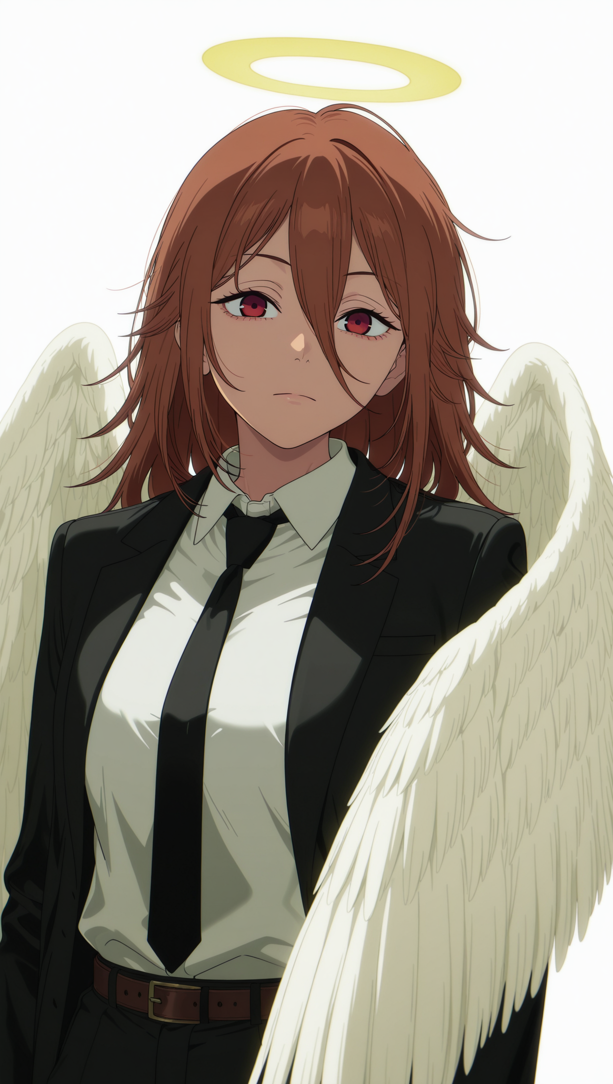 动漫上色,杰作,最佳质量,惊人的质量,4ng3l,1个女孩,长发,棕色头发,红眼睛,中等胸部,光环,天使翅膀,衬衫,白衬衫,有领衬衫,领带,黑色领带,夹克,黑色夹克,腰带,裤子,黑色裤子,单人,姿势,站立,看着观众,正面,((((白色背景,简单背景))))