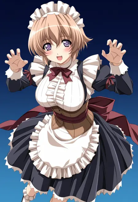 메이드 복장, 메이드 헤드기어, 넥타이, 진한 빨강 리본, 진한 빨강 리본, 검은 드레스, 중앙 프릴, 갈색 코르셋, 언더버스트, 퍼프 긴 소매, 레이스 장식 소매, 진한 빨강 벨트, 뒷쪽 리본, 큰 리본, 허리 앞치마, 메이드 앞치마, 프릴 양말, 메리 제인 신발,