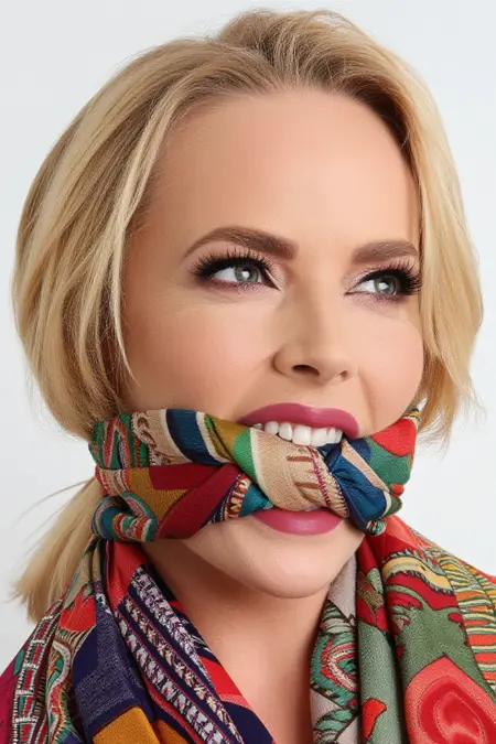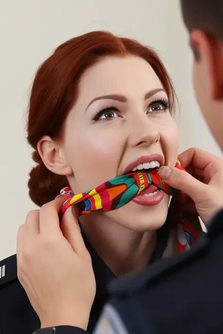 围巾也可以出现在头发上(尝试这样提示——但效果还不够稳定),它还能生成一个男人正在塞嘴的场景。