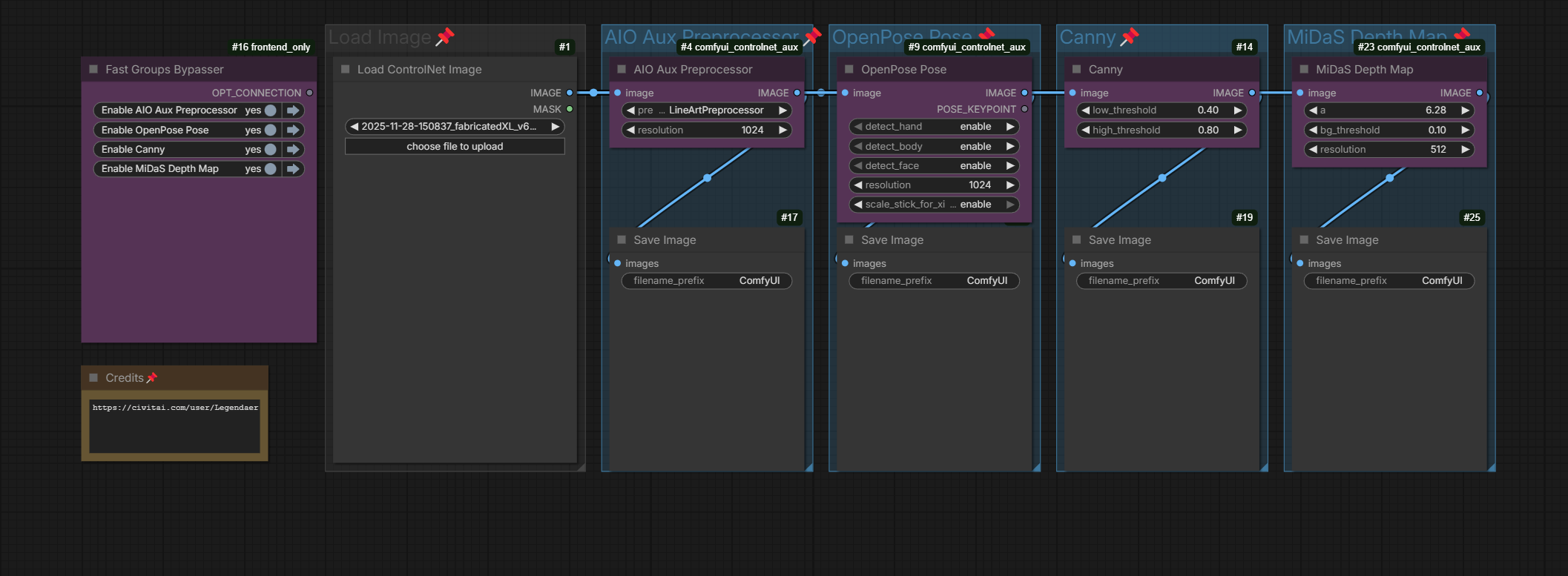 전처리기: 전체 생성을 실행하지 않고 입력 이미지에서 OpenPose, Canny, LineArt, Depth 맵을 생성하는 빠른 워크플로우