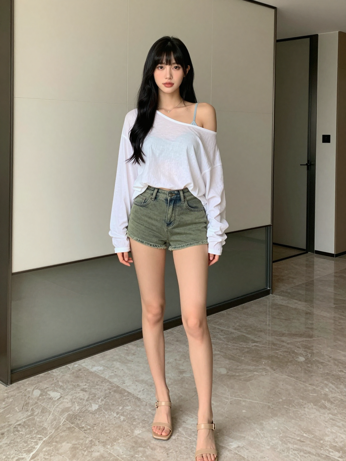 A woman with thick, smooth black hair that falls past her shoulders in natural wavy curls. Her facial features are clear and soft, with a straight nose bridge, plump and rosy lips, and a smooth, even complexion with a healthy warm light beige tone. Her body proportions are long and graceful, with a slender waist, straight and long legs, and full, curved bust. She is wearing a set of pale purple lace underwear, including a triangle bra with a bow and matching panties, made of lightweight fabric with strong translucency and intricate lace embroidery on the edges. She is also wearing a pair of silver metallic one-piece sandals with a simple design and no extra decorations, revealing her full arch and toes. The scene is set in a modern kitchen environment with soft shadow effects on her body.