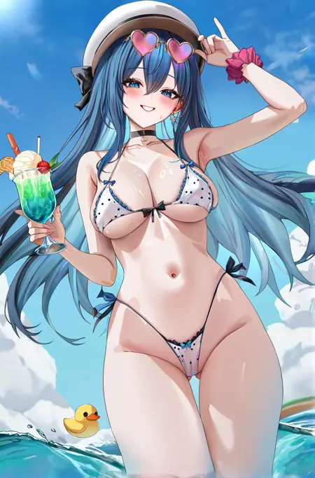 @yi_kuai_cha_suyou original, 1girl, arm up, bikini, blue eyes, blue hair, blush, cherry, cup, day, double-parted bangs, drinking straw, feet out of frame, food, fruit, grin, hair between eyes, hat, heart, heart-shaped eyewear, holding, holding cup, ice cream, ice cream float, innertube, long hair, looking at viewer, outdoors, polka dot, polka dot bikini, rubber duck, scrunchie, smile, solo, summer, sunglasses, swim ring, swimsuit, water, watermark, white bikini, white hat, wrist scrunchie