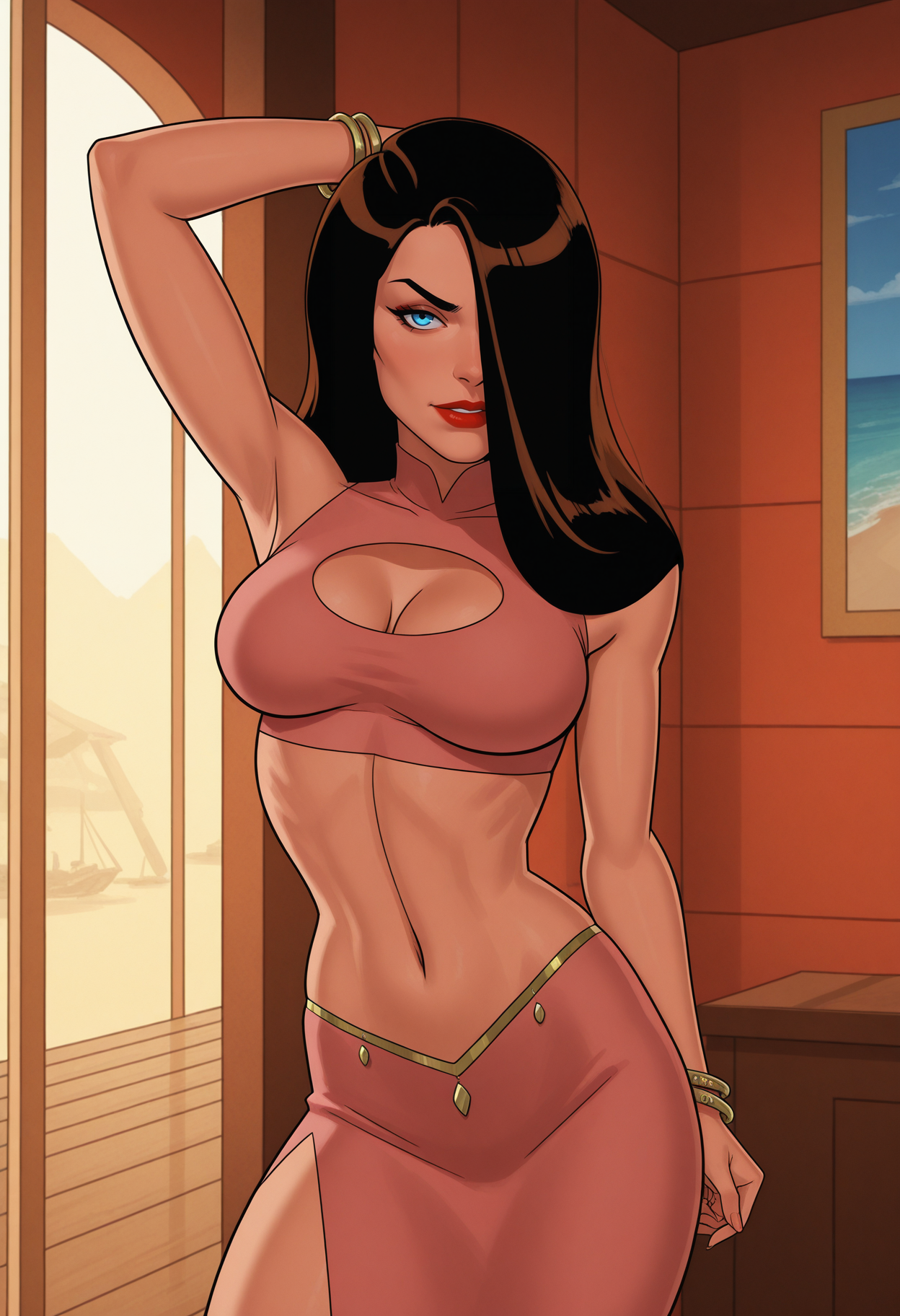 talia_su_yacht_outfit, pink outfit, jewelry, bracelet, bare shoulders, crop top, cleavage, clothing cutout, cleavage cutout, midriff, navel, skirt, long skirt, side slit,