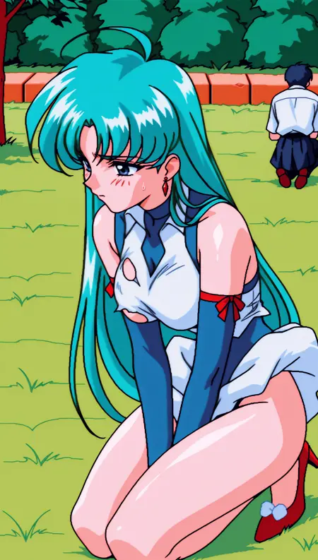 Milfy: skirt, red high heels, blue leotard, detached sleeves