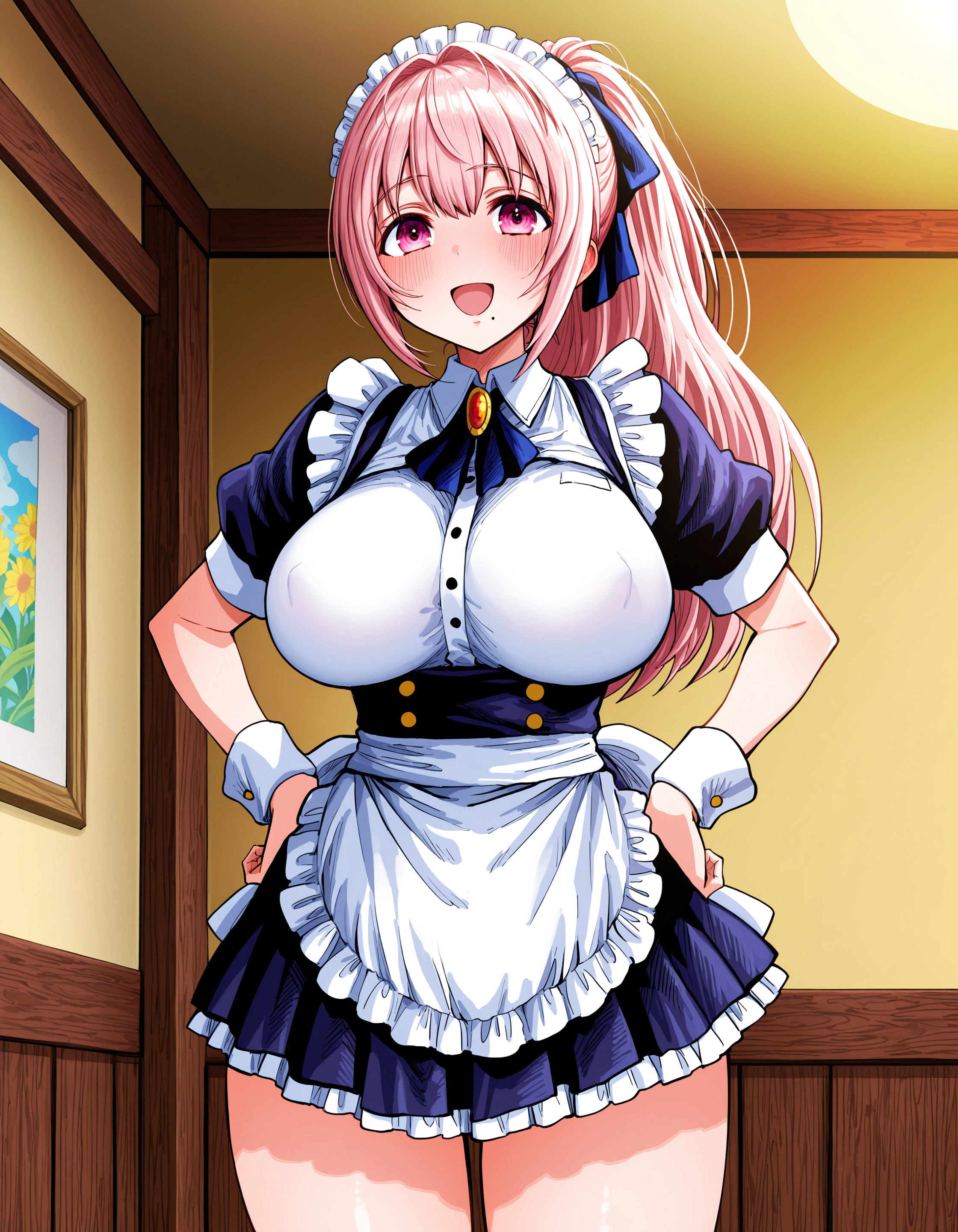 1girl, sayama_saho,mole under mouth,large breasts, breasts, long hair, pink hair, bangs, jewelry, pink eyes, ponytail, scrunchie,