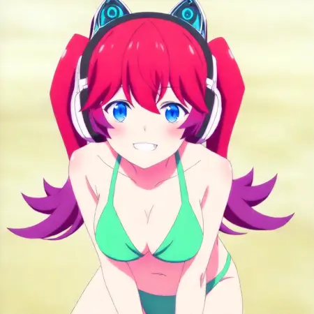 amelia irving \(renai flops\), multicolored hair, red hair, purple hair, twintails, bangs, blue eyes, cat ear headphones, school uniform, jacket, open clothes, sweater, heels, large breasts, 1girl, solo