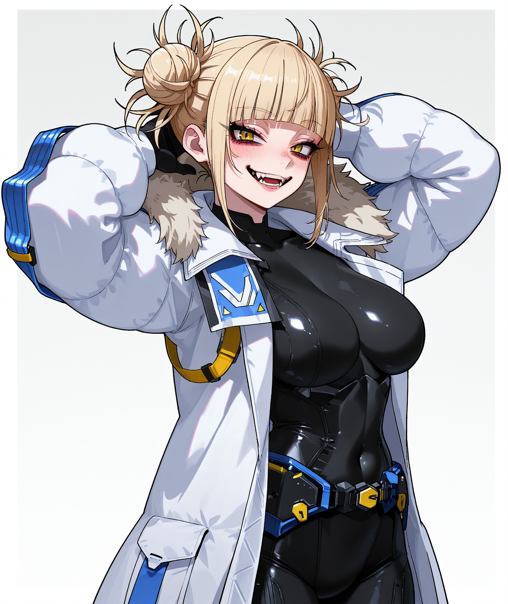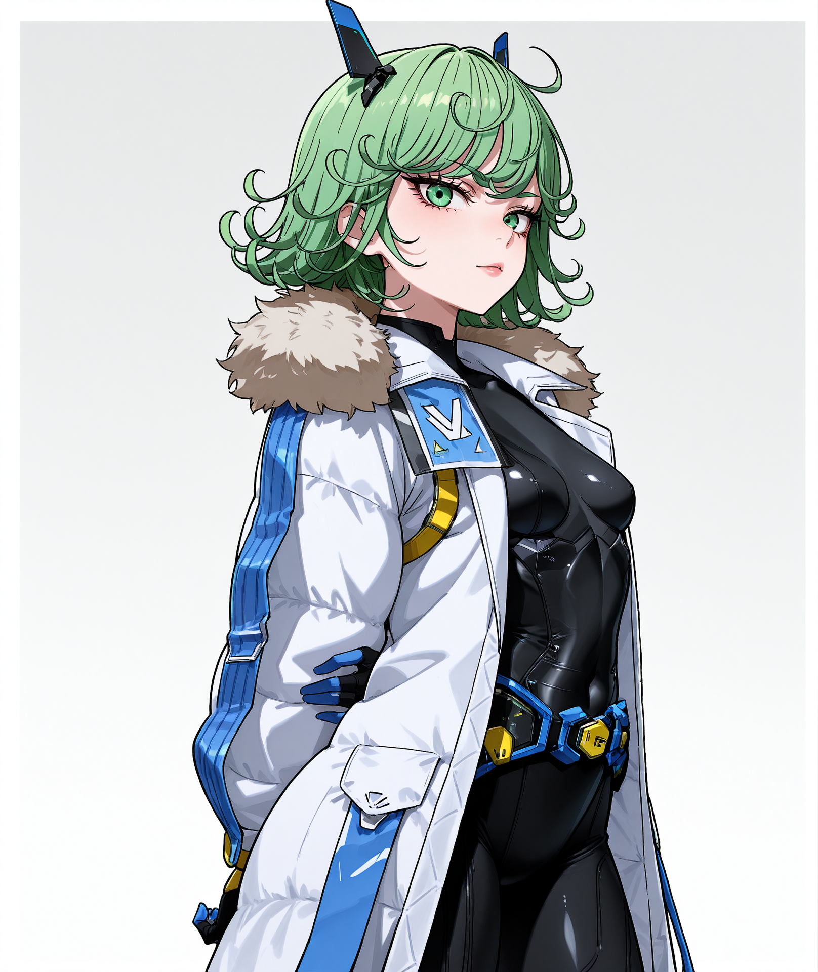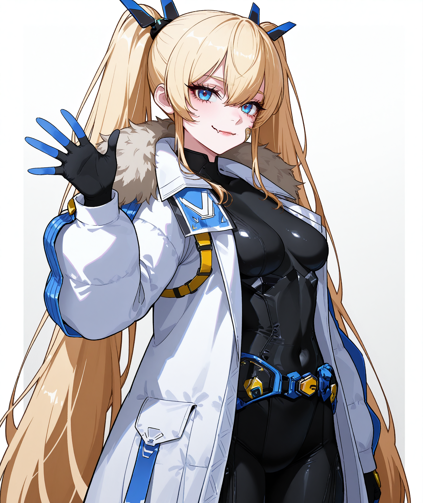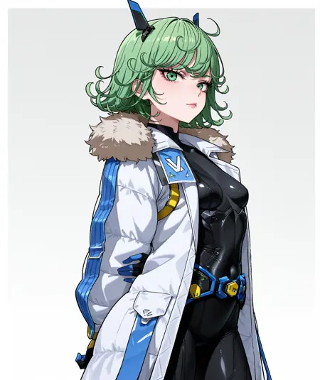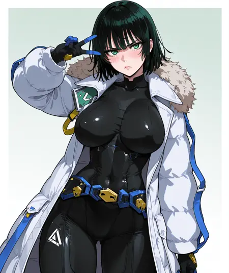 - hair ornament, bandaid, bandaid on cheek, bandaid on face, long sleeves, gloves, jacket, open clothes, black gloves, belt, coat, fur trim, covered navel, bodysuit, headgear, skin tight, open coat, fur collar, white coat, black bodysuit, fur-trimmed coat, two-tone gloves,