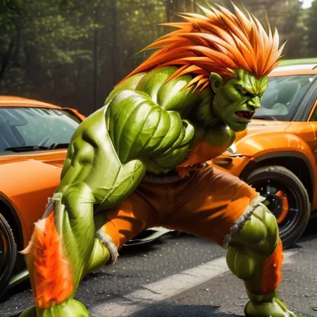 Trigger : green skin, muscular, orange hair, long hair, teeth, abs, fangs, sharp teeth, monster man, light brown shorts with fur, hair on arms,