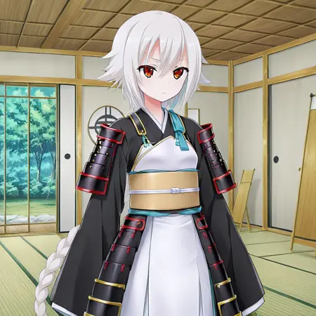 服部小平太和忠:SenKoi、小平太、白髪、一つ編み、非常に長い髪、眉間に髪、オレンジ色の目、小さい胸