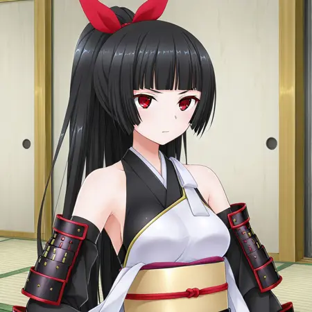 毛利新助良勝:SenKoi、新助、黒髪、前髪がまっすぐ、ポニーテール、長い髪、赤い目、中くらいの胸、髪飾り