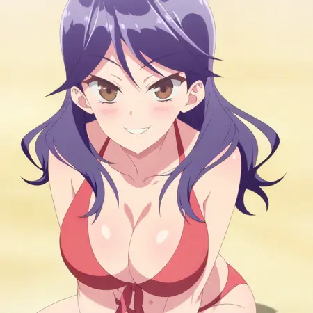 ayuko kawase \(we never learn\), dark purple hair, long hair, bangs, brown eyes, collar, bow, school uniform, skirt, heels, large breasts, 1girl, solo
