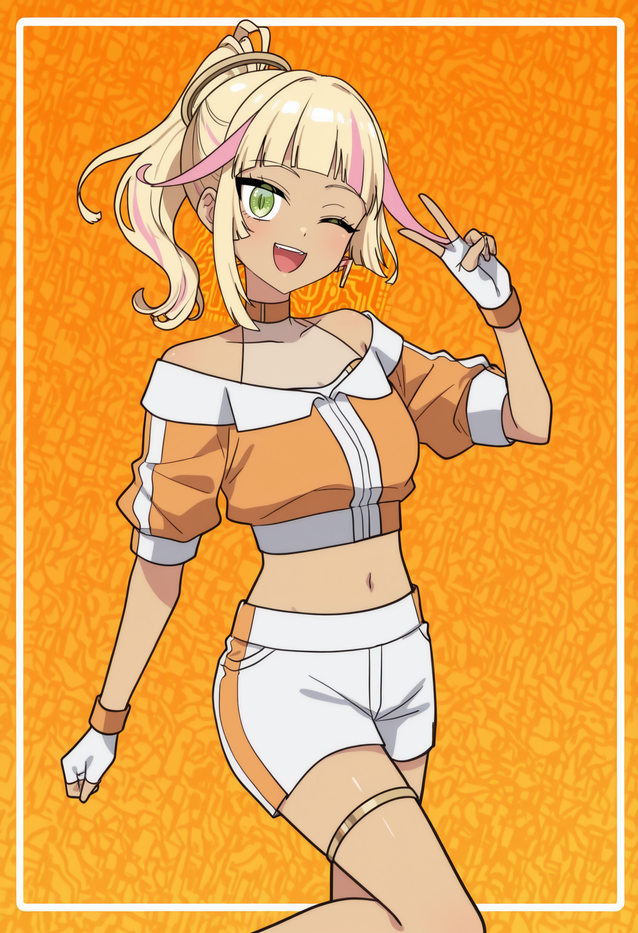 イヤリング, ジュエリー, チョーカー, オレンジ色のシャツ, クロップドトップ, 短い袖, 指なし白手袋, ショートパンツ, 太ももリング, 裸の肩, 鎖骨, お腹, へそ, 太もも,