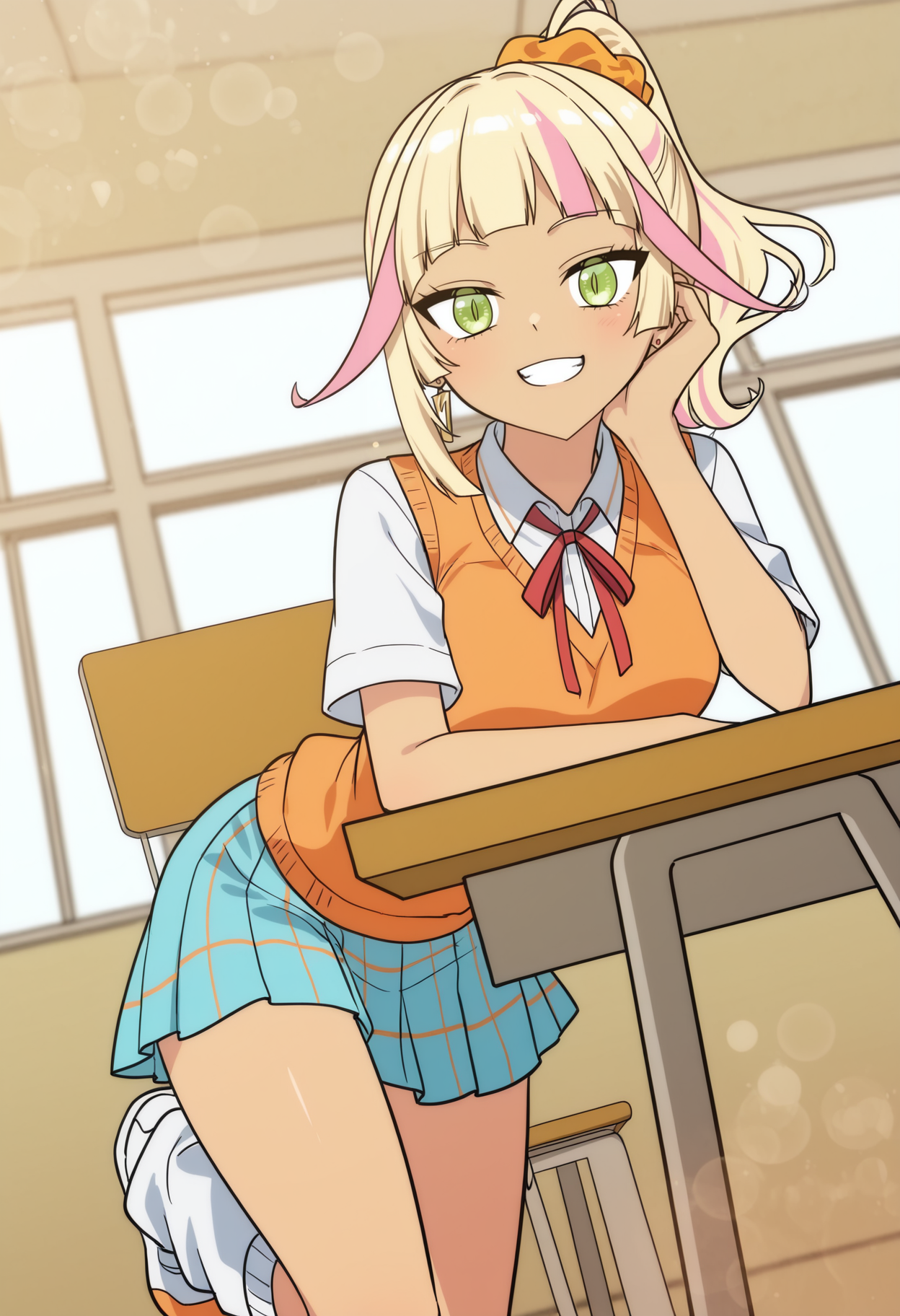 1girl, angel-no7(flag_chan!), 緑の目, 多色の髪, 金髪, ピンクのストライプ入り髪, ポニーテール, ベリーバング, サイドロール, 濃い肌色,