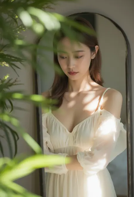 鏡面を通して反映された画像は、深遠な空間感を含み、多次元的で豊かに層化された視覚的効果を呈し、より物語的でナラティブです。これは、夢幻的な雰囲気と空間感を組み合わせた創作です。