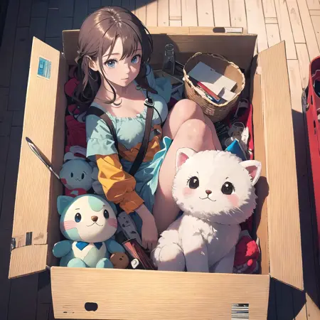 Works best with cardboard box or crate. But you can try different containers but that depends on your prompt and luck. Pose will be there.