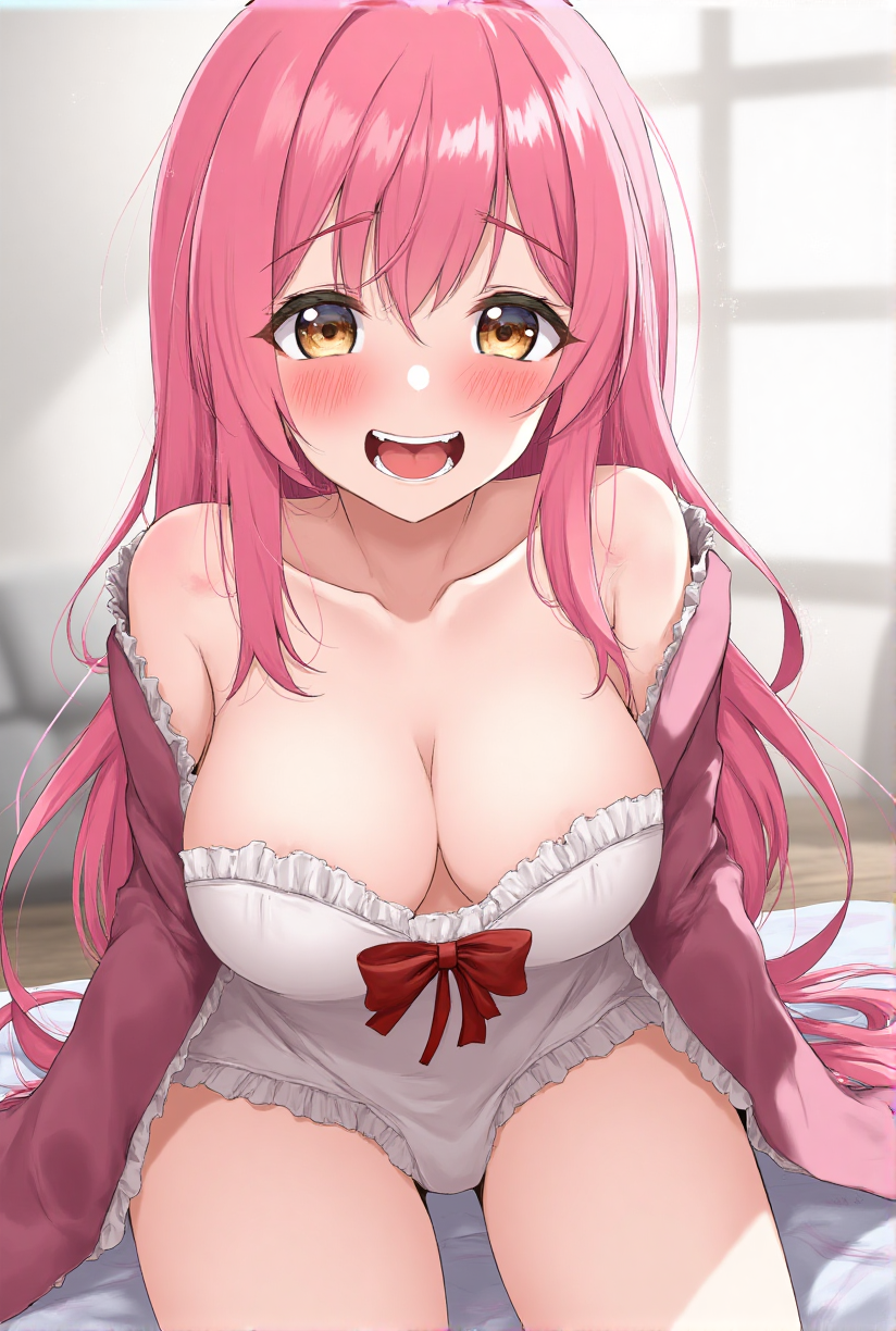 1 girl, solo, looking at viewer, pink long hair, blushing, smiling, innocent, brown eyes, tight clothing, cleavage, extending hand, sticking out tongue, playful and cute, opening mouth