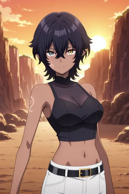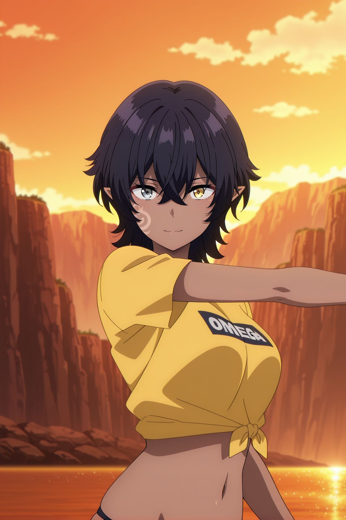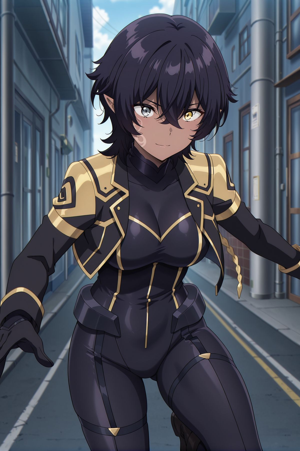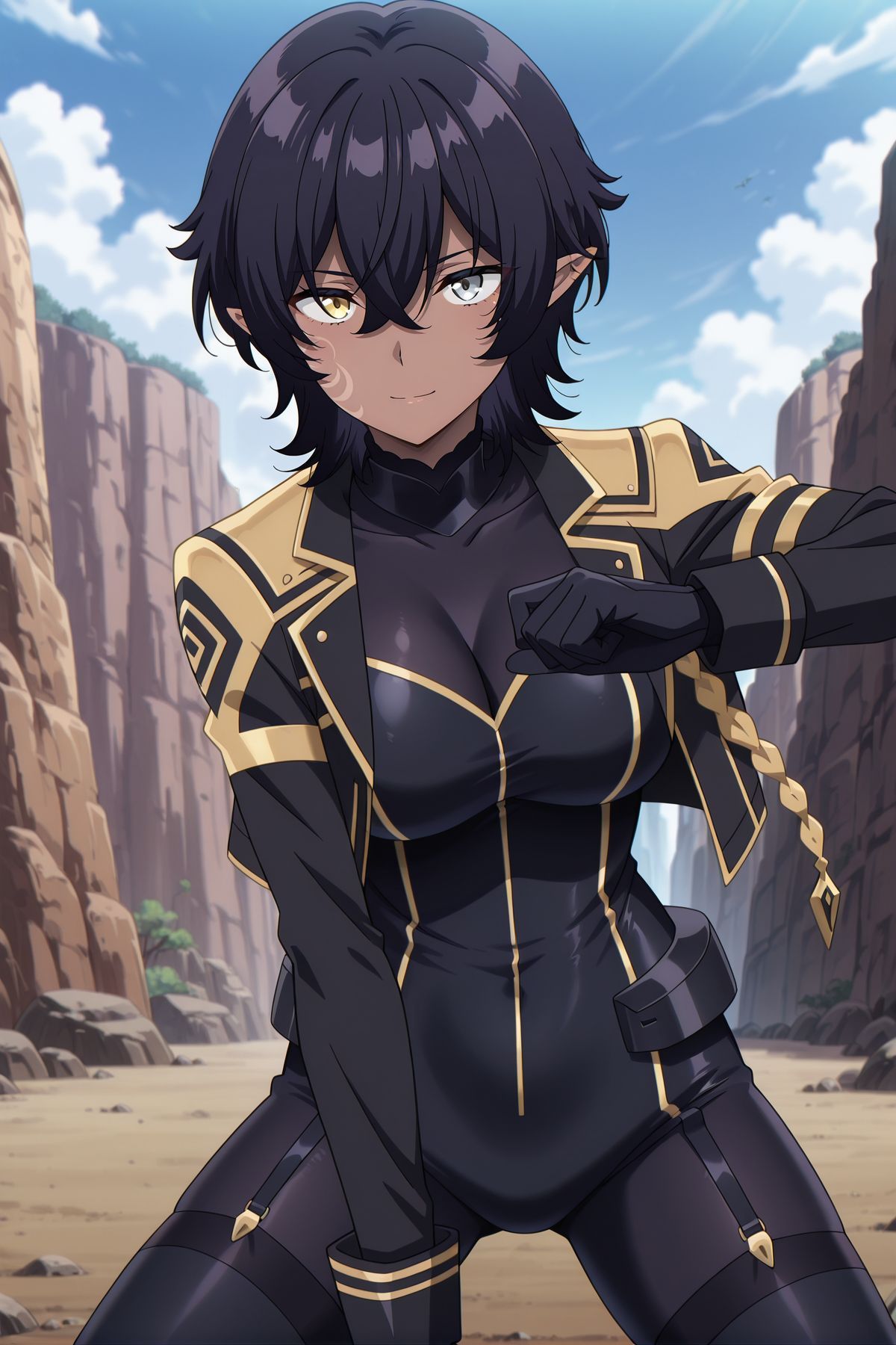 Omega, 1girl, solo, heterochromia, grey eyes, yellow eyes, black hair, medium hair, hair between eyes, dark-skinned female, facial tattoo, pointy ears, elf,