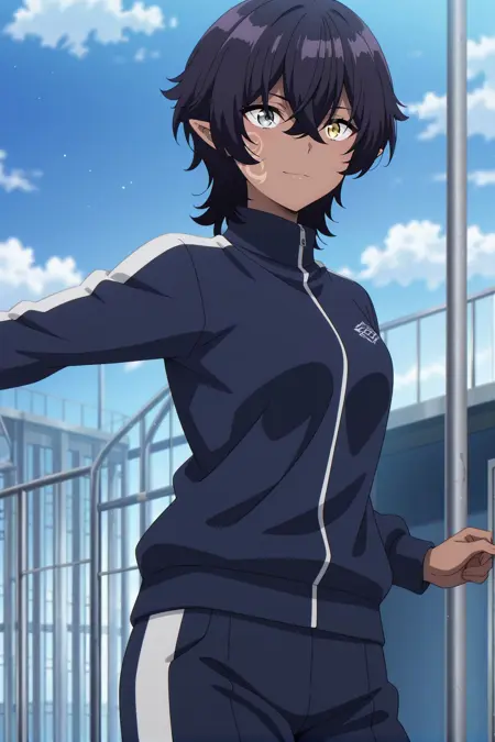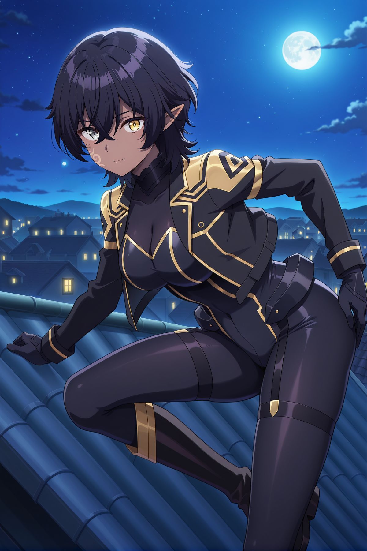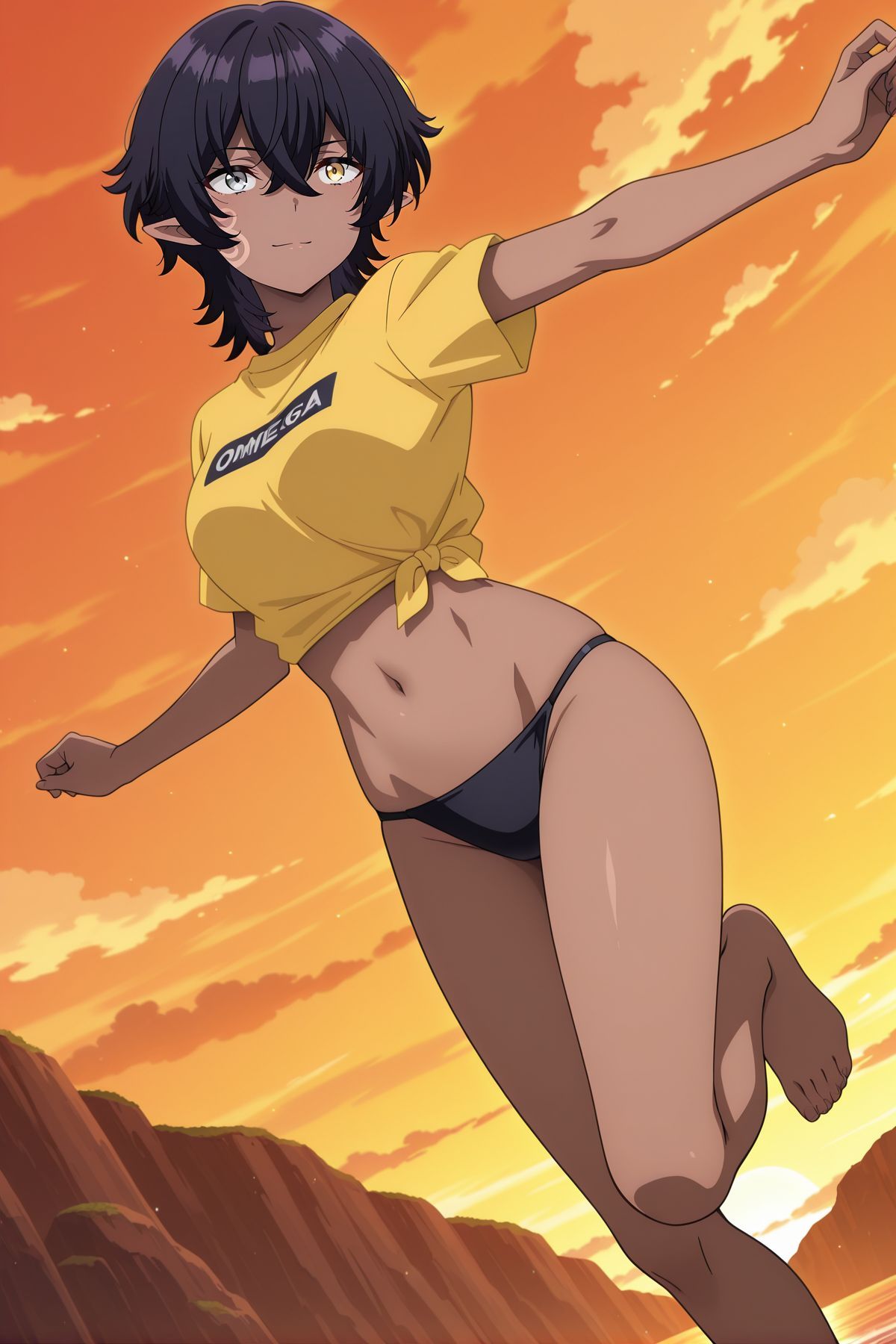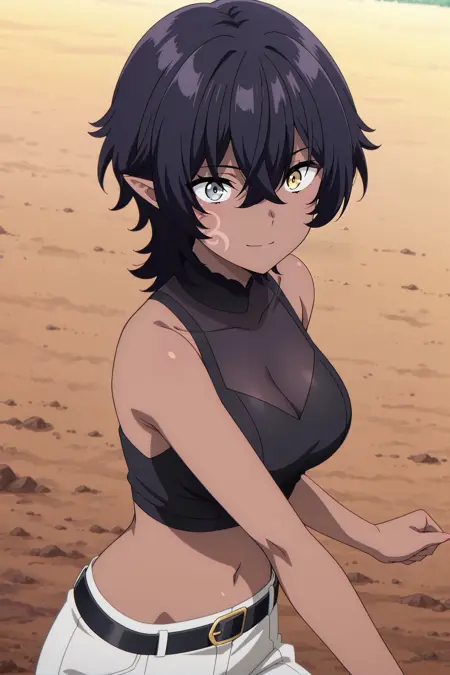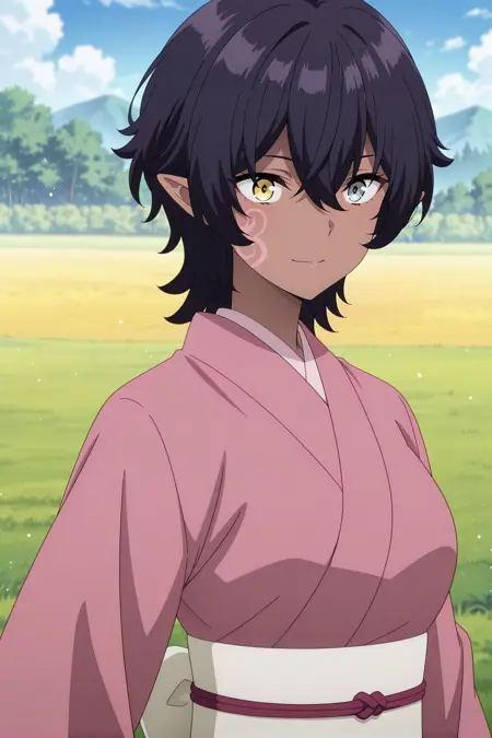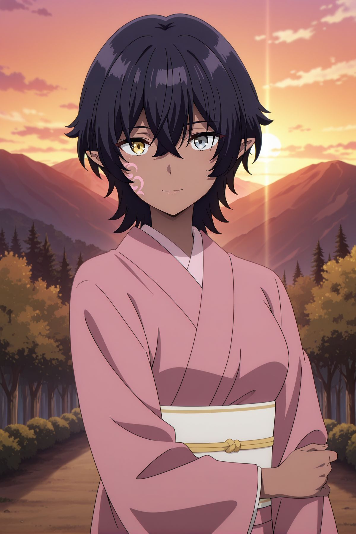 Omega, 1girl, solo, heterochromia, grey eyes, yellow eyes, black hair, medium hair, hair between eyes, dark-skinned female, facial tattoo, pointy ears, elf,