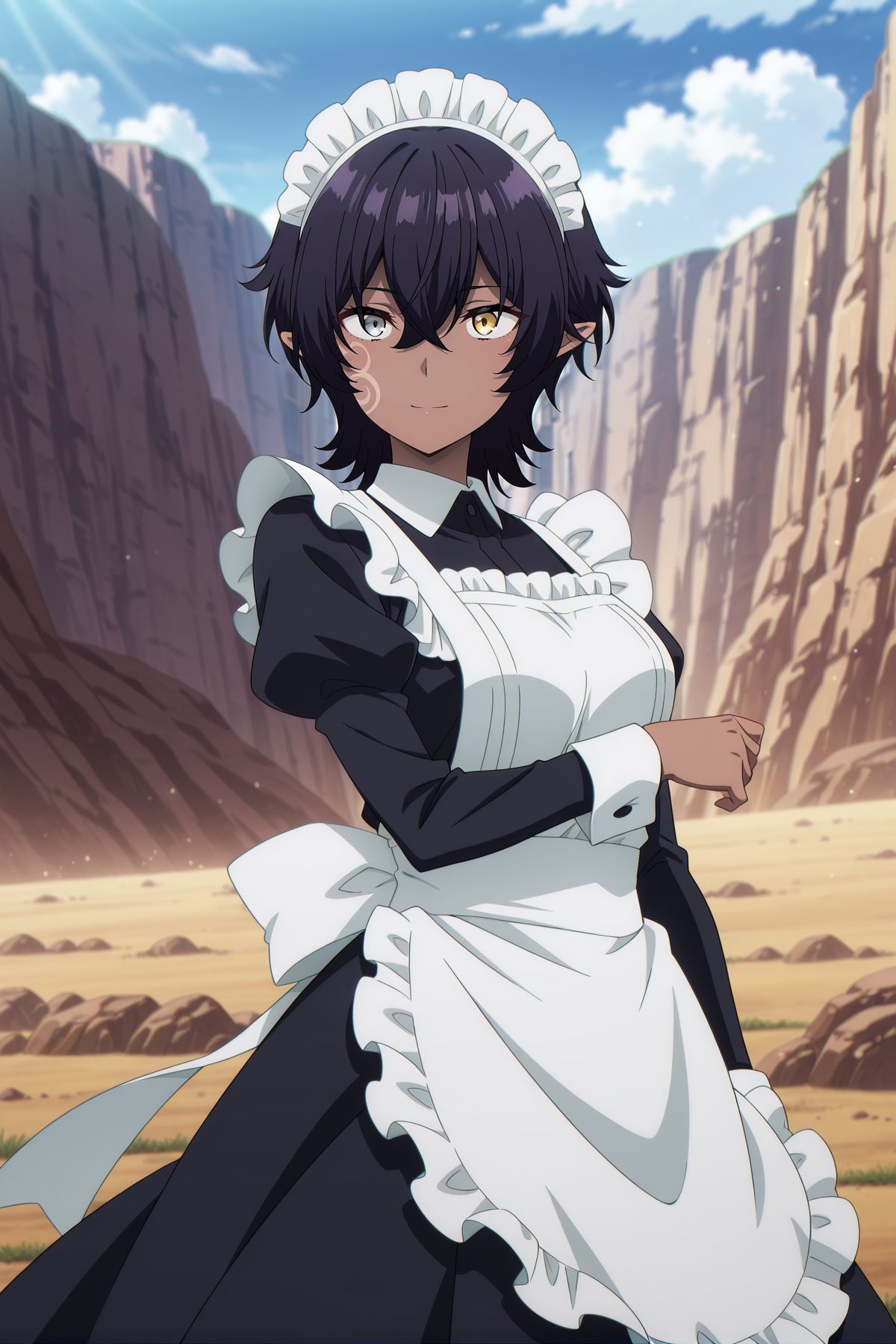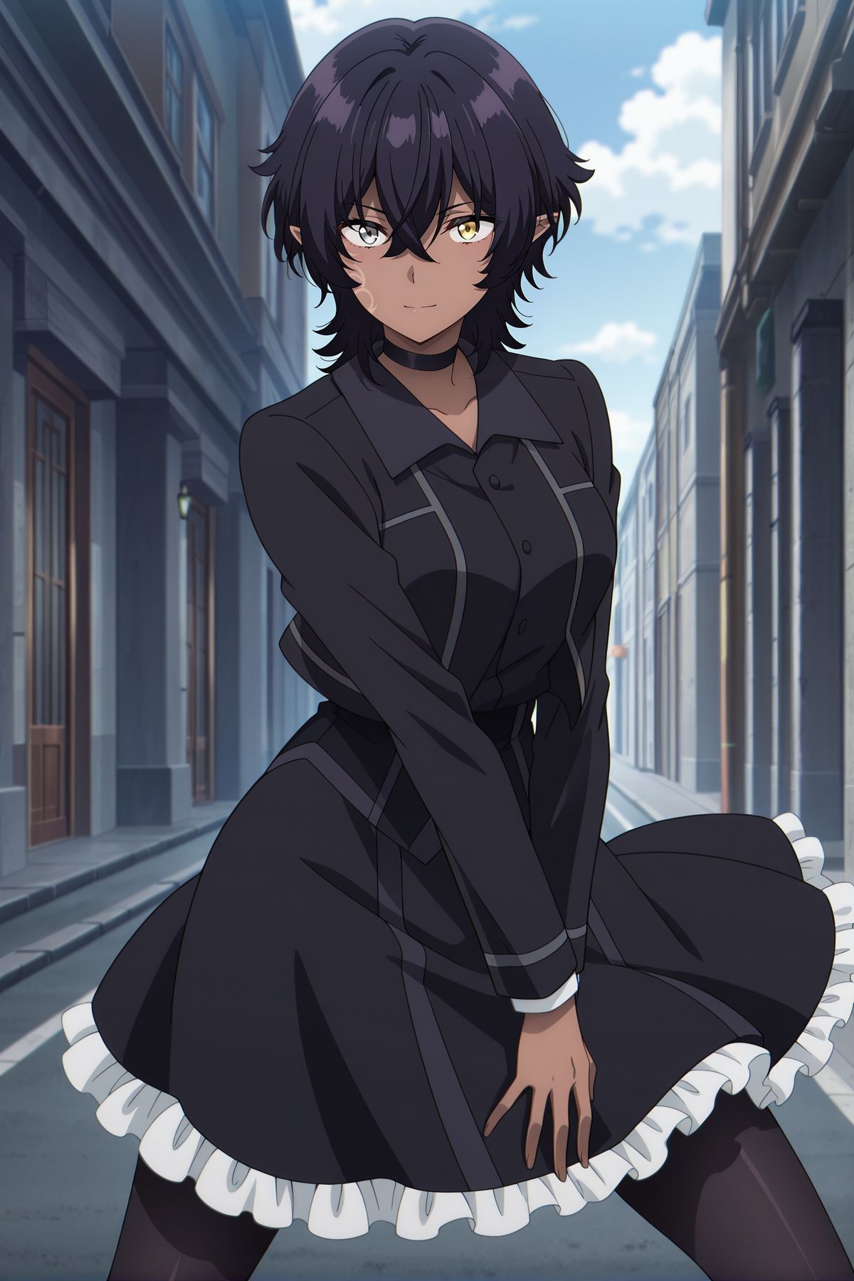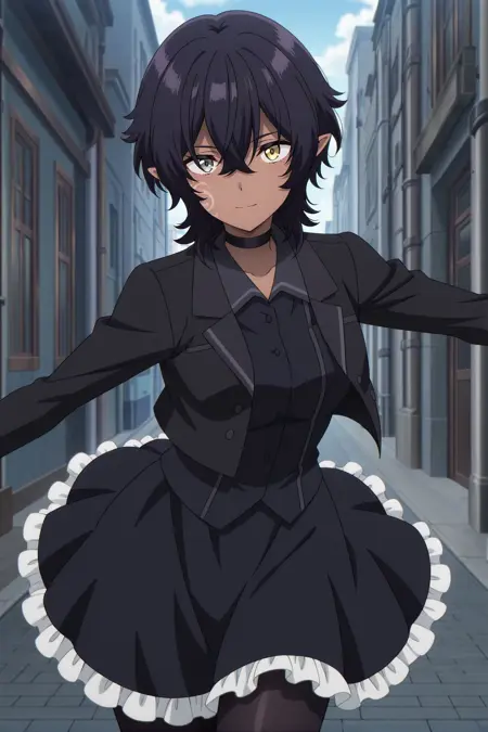 female butler, black choker, collared suit, black suit, black skirt, frilled skirt, black pantyhose,