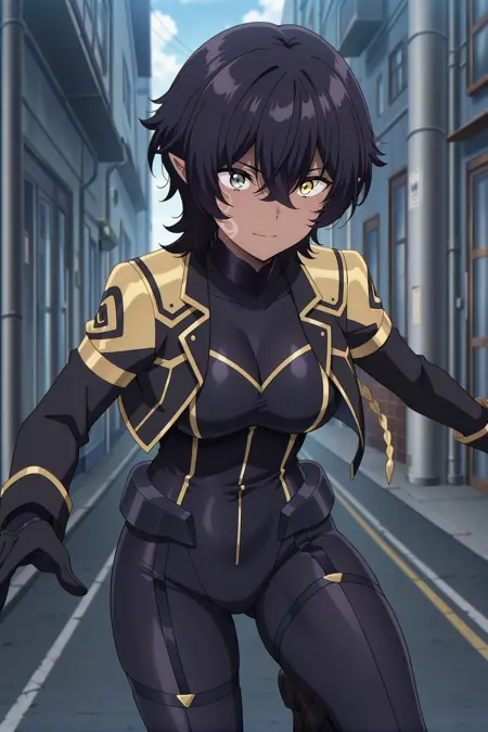 black jacket, open jacket, long sleeves, gold trim, black bodysuit, black gloves, black thighhighs, garter straps, black boots,