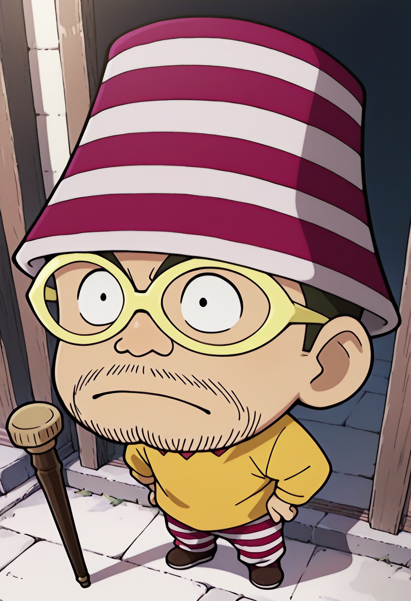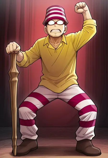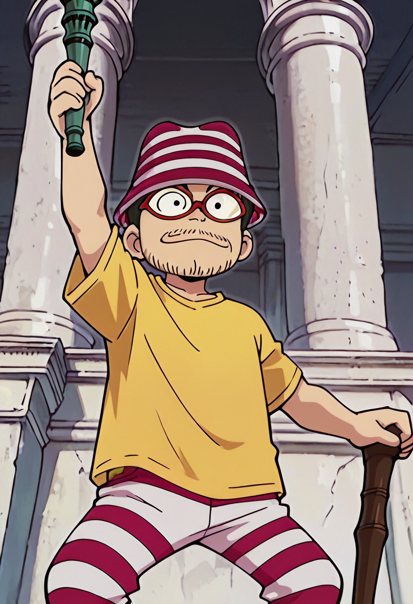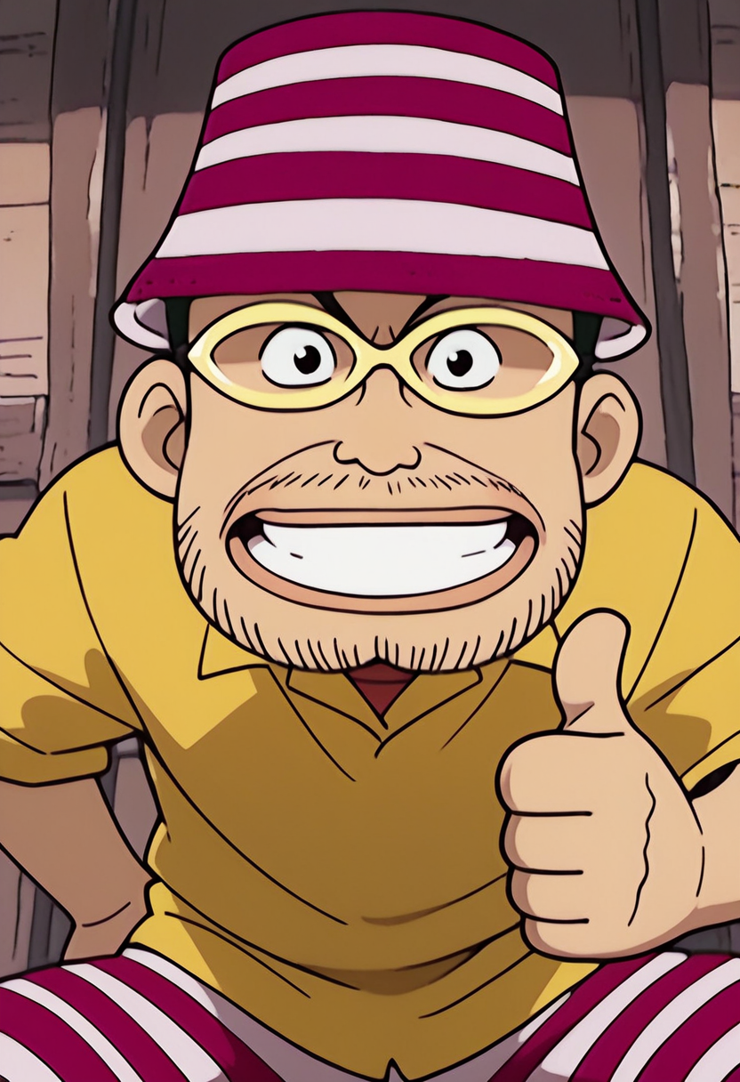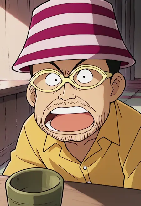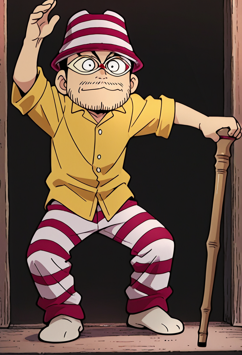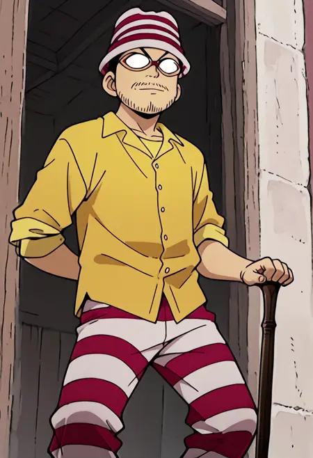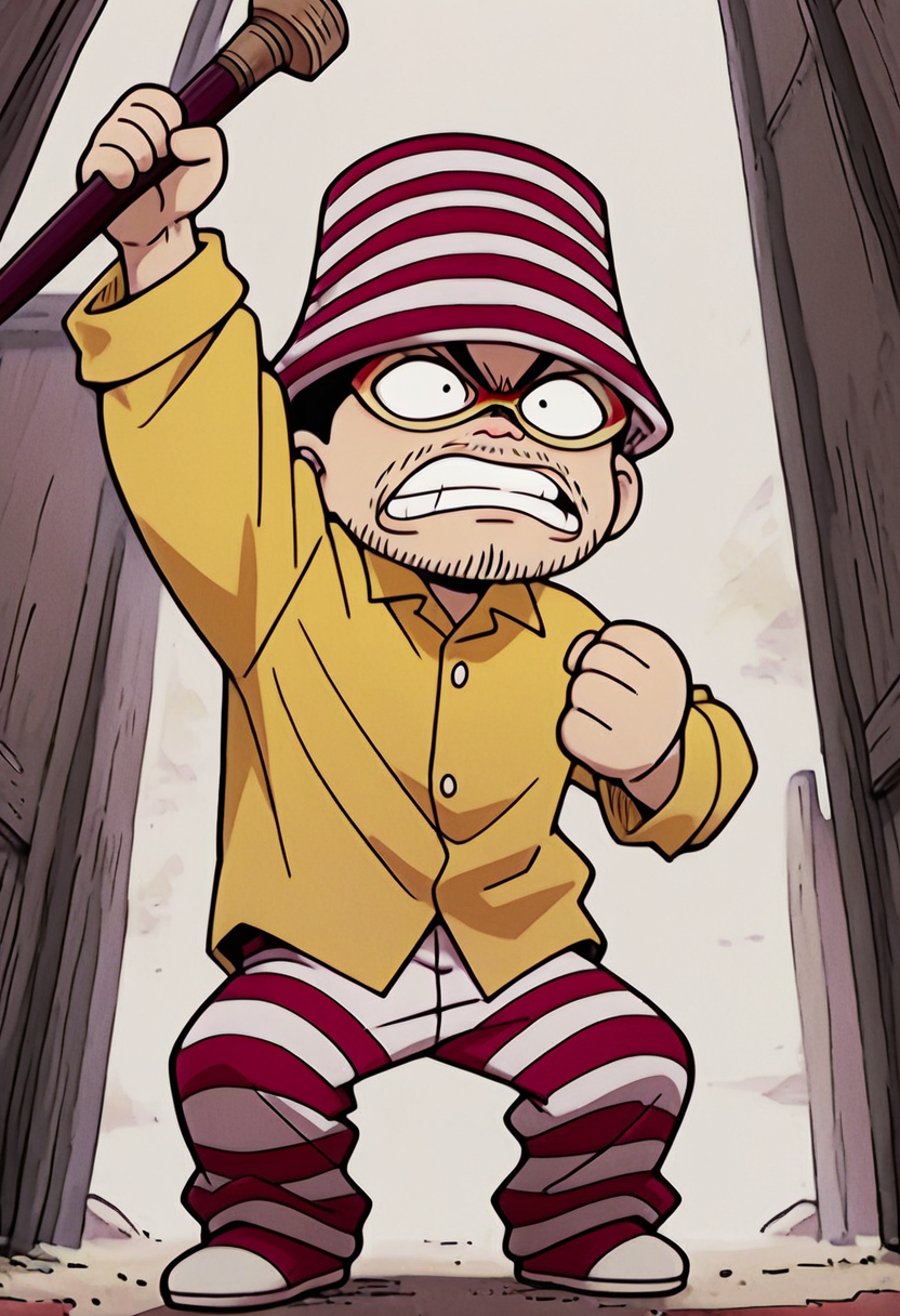 A character LoRa for Woop Slap from One Piece. He is the mayor of Luffy's hometown Foosha Village (Windmill Village) and appears first in Episode 4 "Luffy's Past! The Red-Haired Shanks Appears" of the anime. Trained on screencaps of Foosha Village Flashback. His cane did not bake in, since it was present in one training image only, so it's generating a generic cane.
