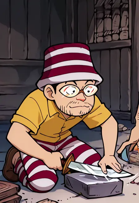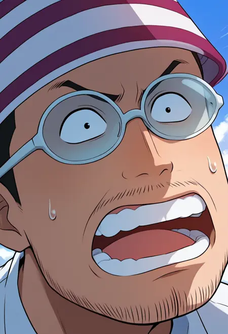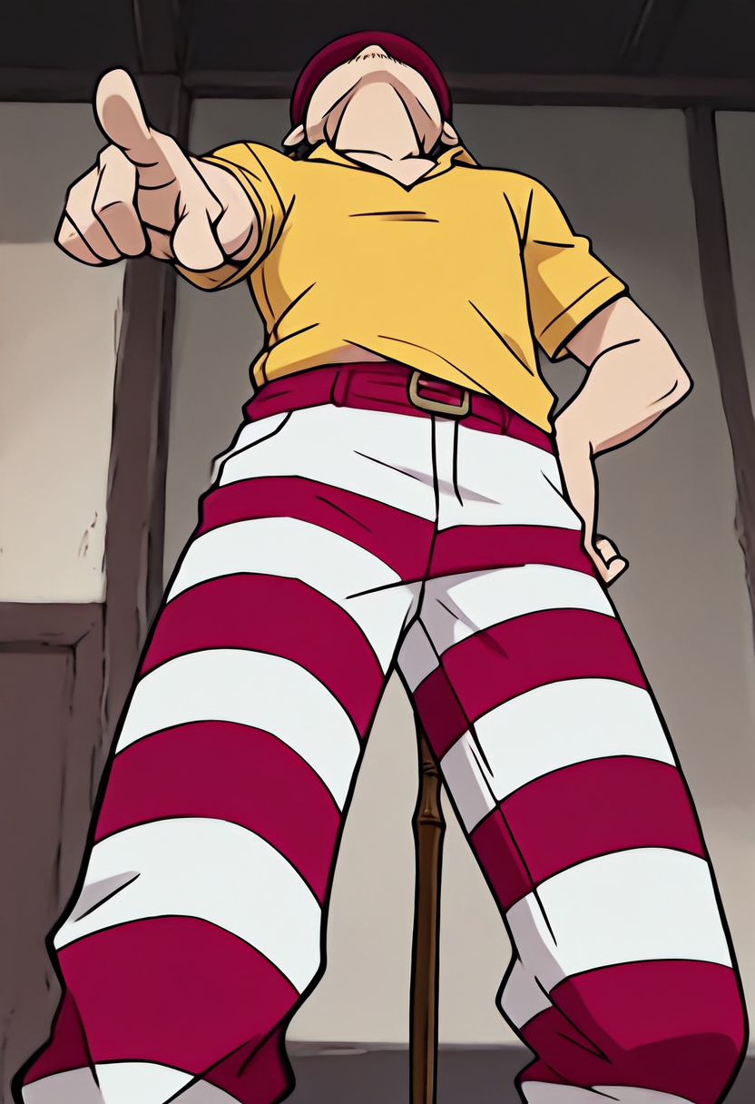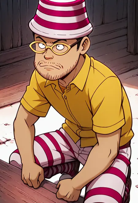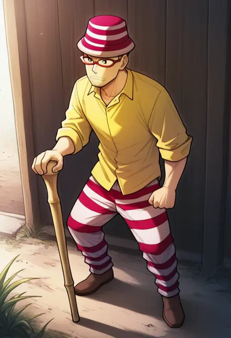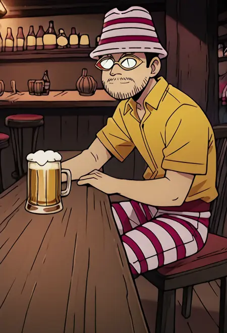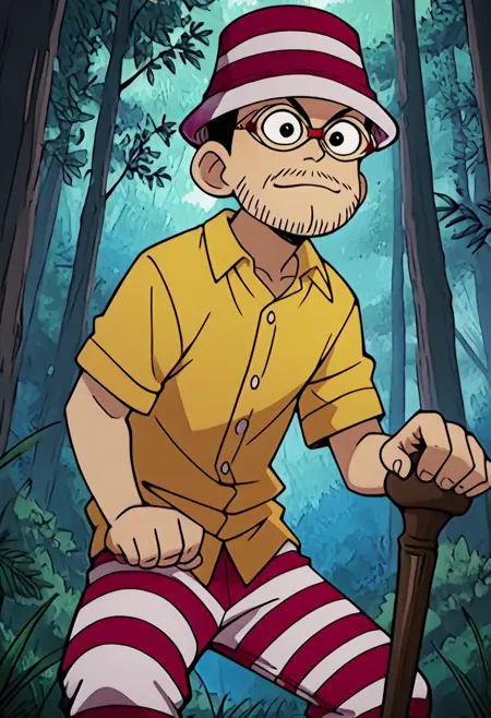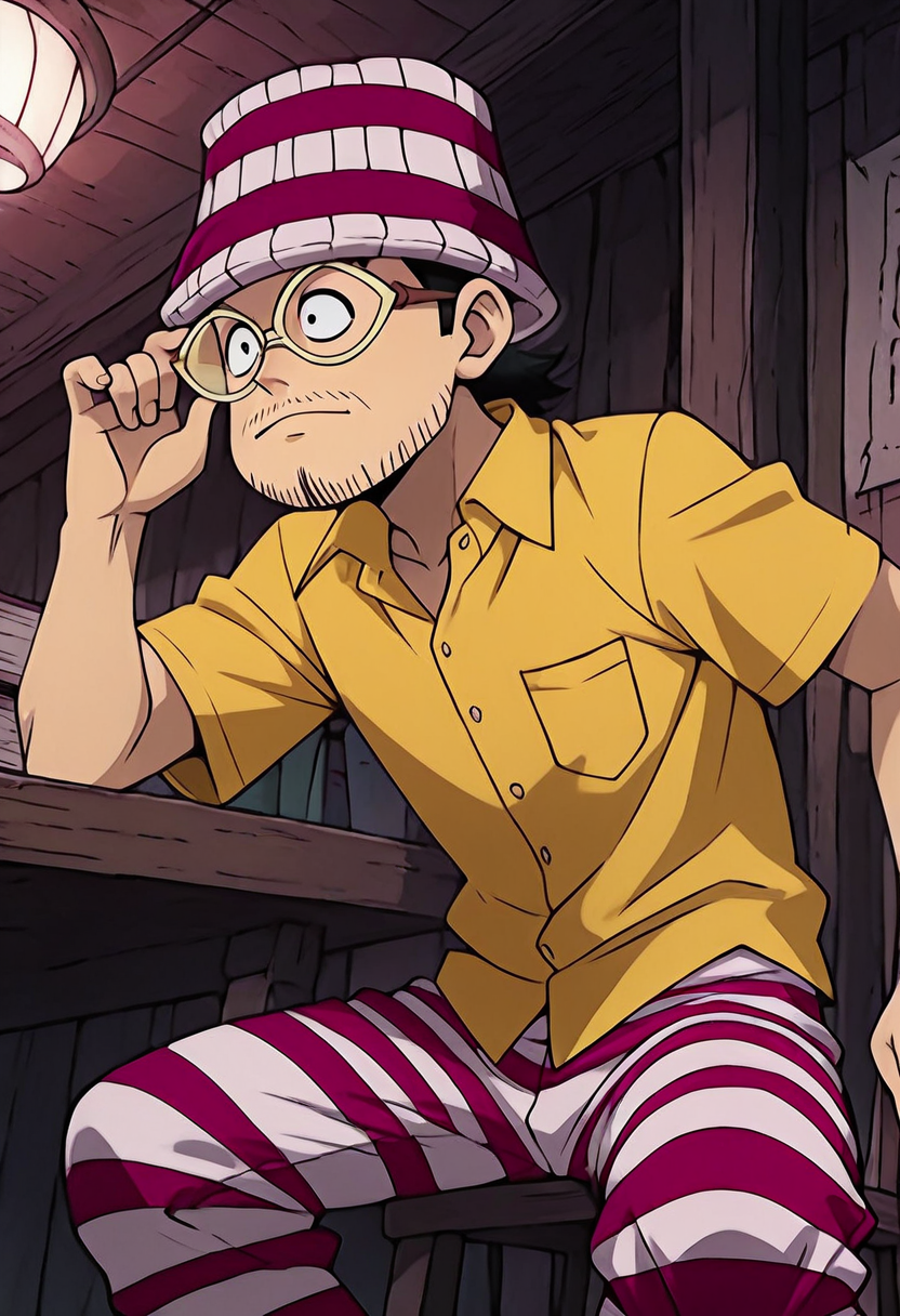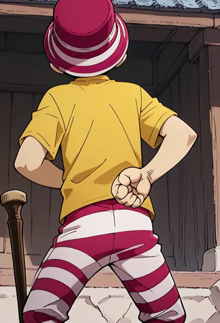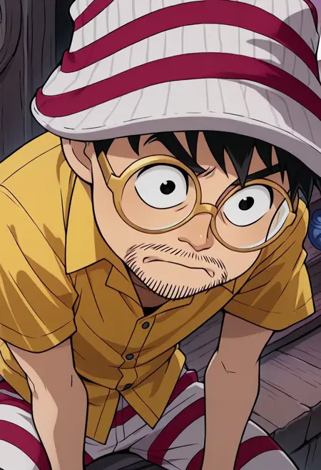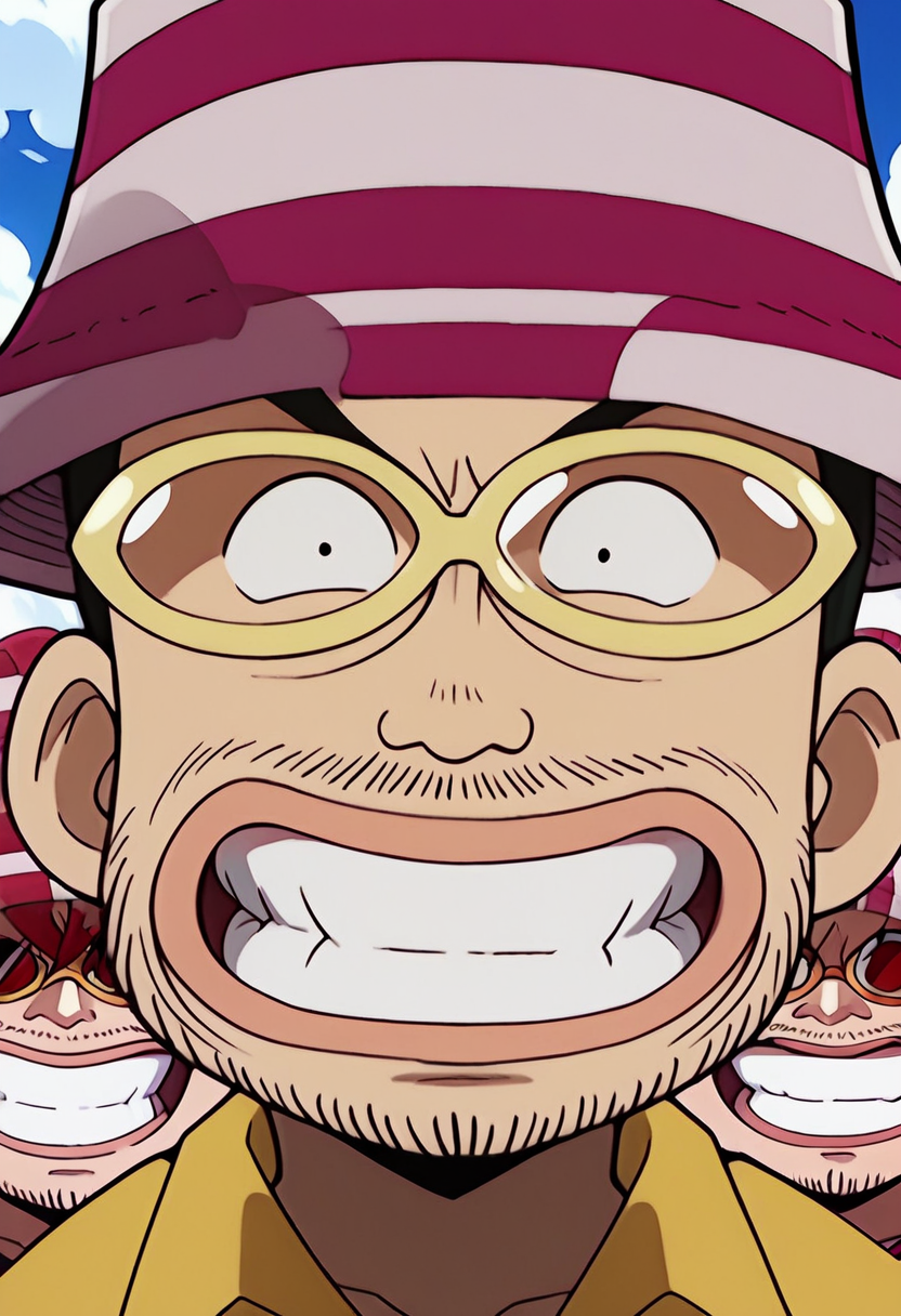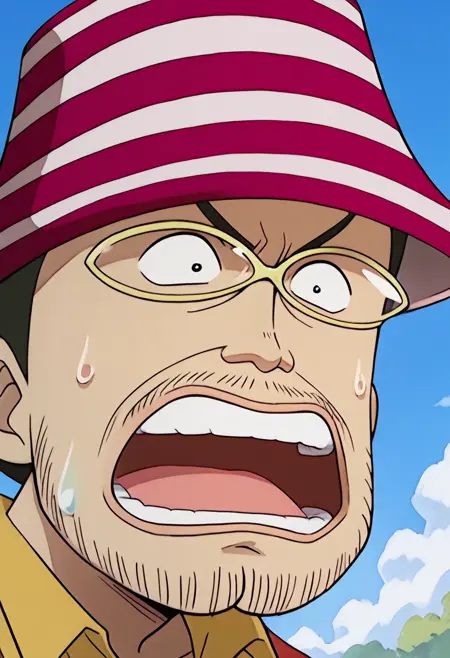 A character LoRa for Woop Slap from One Piece. He is the mayor of Luffy's hometown Foosha Village (Windmill Village) and appears first in Episode 4 "Luffy's Past! The Red-Haired Shanks Appears" of the anime. Trained on screencaps of Foosha Village Flashback. His cane did not bake in, since it was present in one training image only, so it's generating a generic cane.