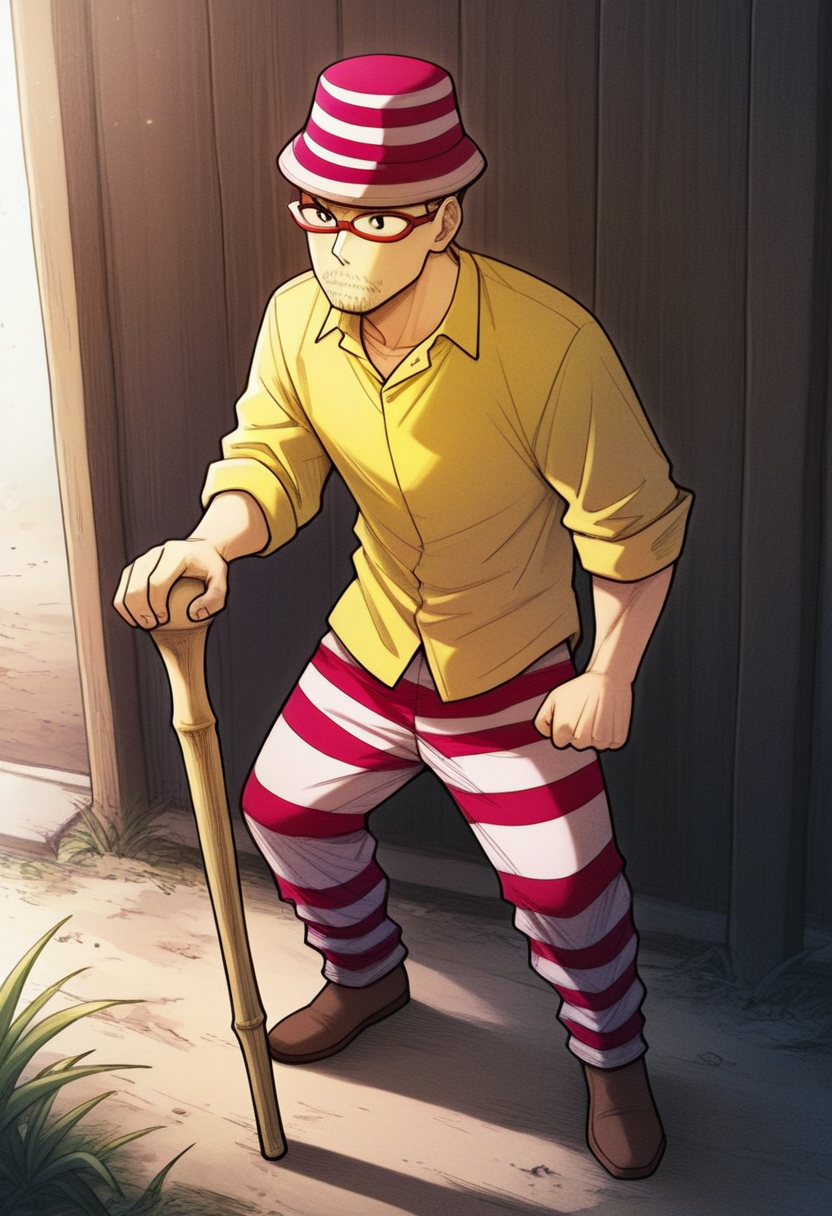 outfit: striped hat, yellow Shirt, short sleeves, striped pants, cane