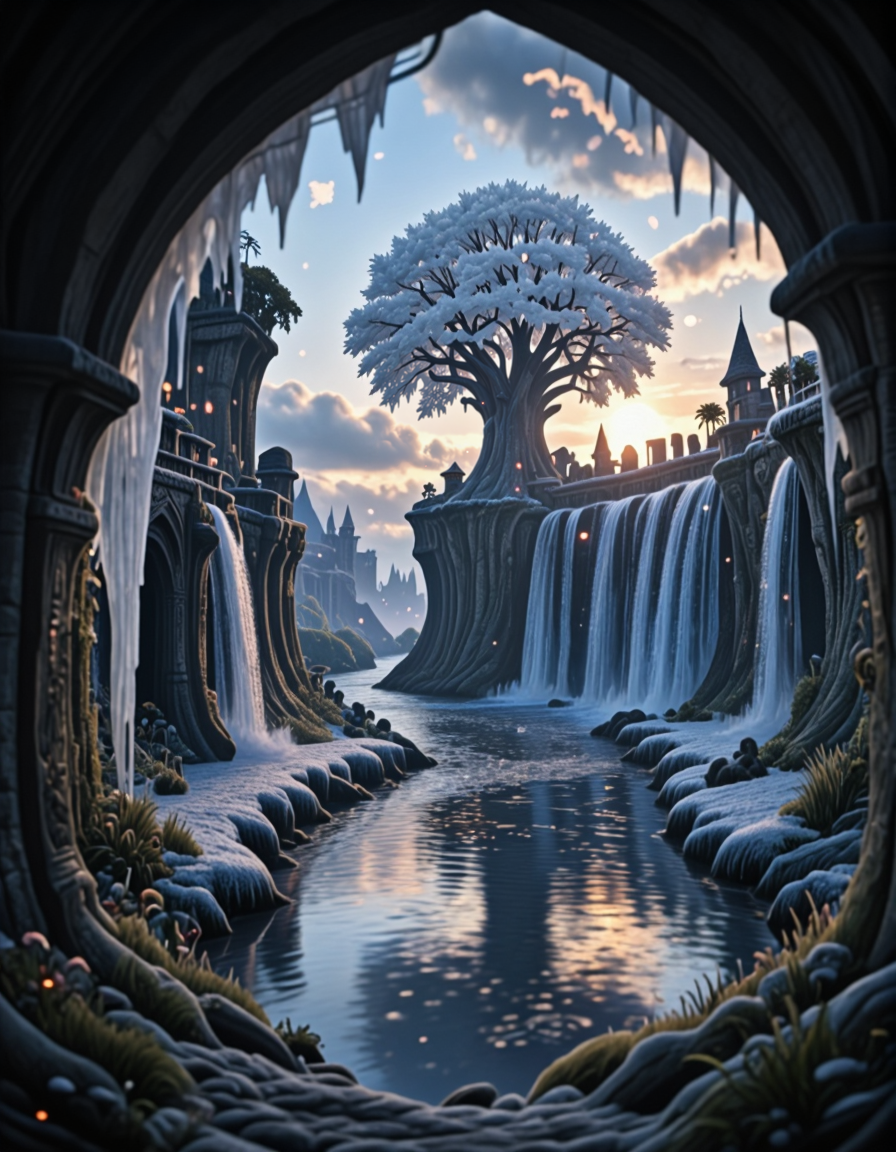 T10, landscape, mountains, waves, rocks, tree, vegetation, moss, rough sea, waterfall, ruins, sunset, blue, orange, yellow, brown,
